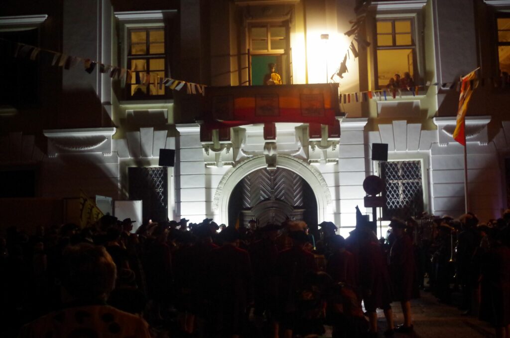 Aulendorf – Wenn der Maskenmeister die fünf Aulendorfer Masken Eckhex, Rätsch und Tschore, Schnörkele und Fetzle aus ihrer Verbannung ruft, kann die Fasnet beginnen. Unter den Trommelklängen des Fanfarenzuges, begleitet von seinem Hofstaat, dem Zunftmeister und den Hohen Räten erscheint der Burggraf und fordert von seinem Maskenmeister die Beschwörung der guten alten Narrengeister. Der lässt sich natürlich nicht lange bitten. Er versichert: “Ha, ha, ha, das mach‘ ich gern, für meinen Burggraf, meinen Herrn! Gleich beginnt der Zauber seinen Lauf – ich befehl‘, Nacht, tu dich auf“: