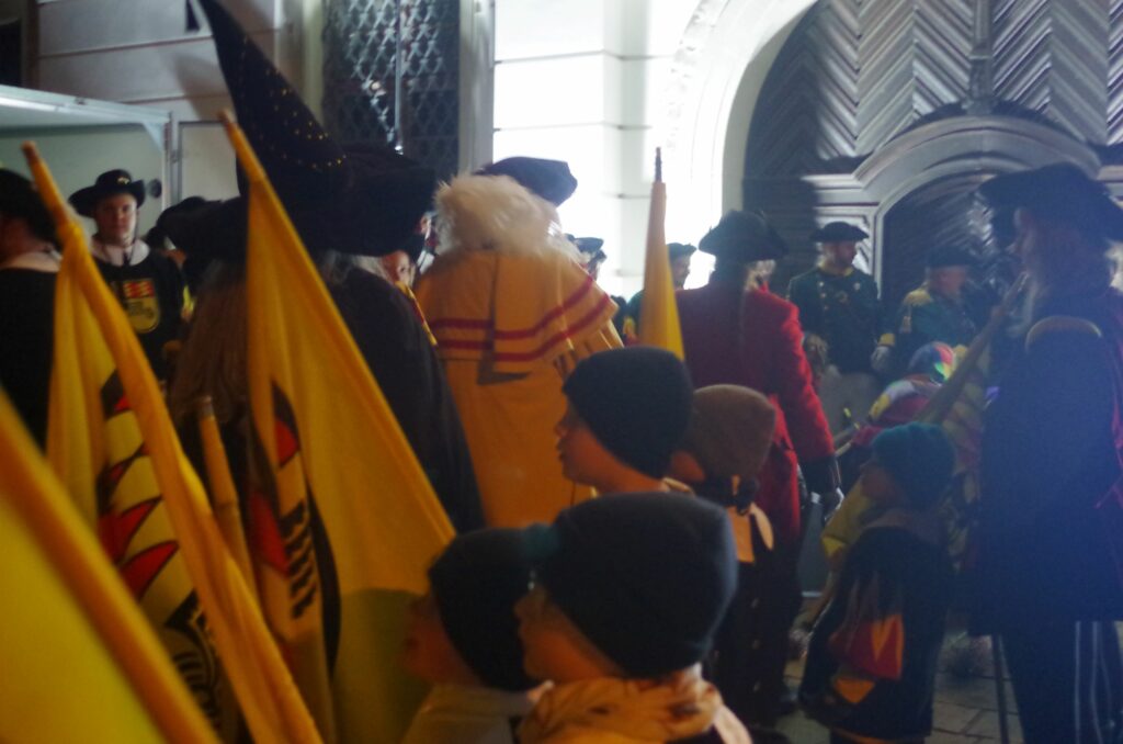 Denn die befreiten Narren wollen mehr, sie wollen das närrische Regiment über die Stadt übernehmen und ziehen deshalb gemeinsam zum Rathaus im Aulendorfer Schloss. Dort fordern sie den Bürgermeister Matthias I. und seinen Gemeinderat auf, die Macht den Narren zu übergeben. Als der Maskenmeister mit einigen Eckhexen den Sitzungssaal gestürmt hat, ist die Verwaltung bereit, die weiße Fahne zu hissen.