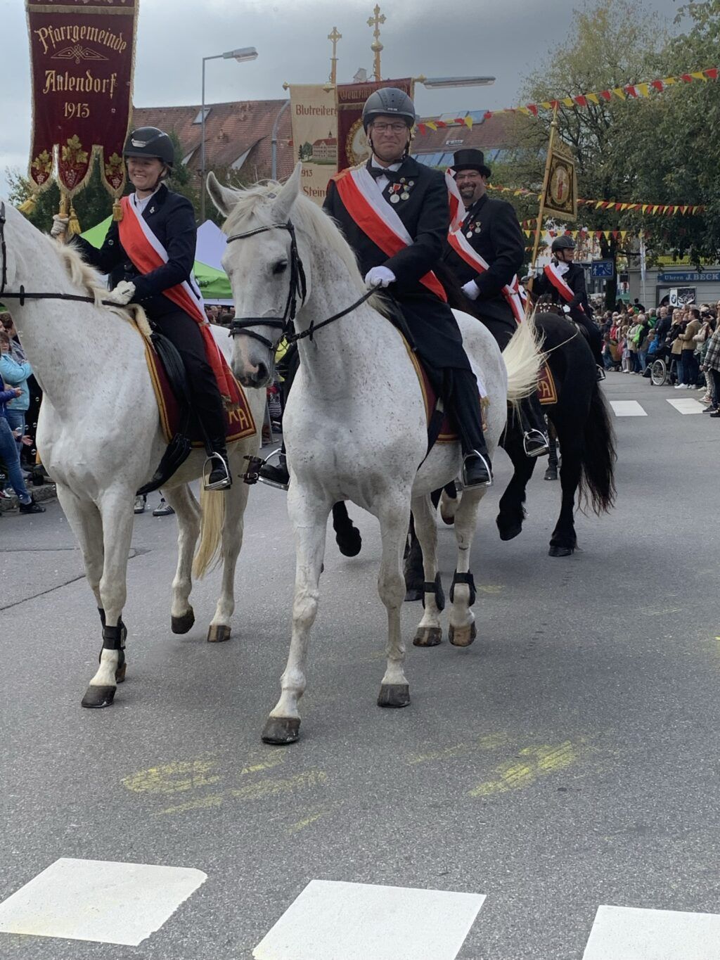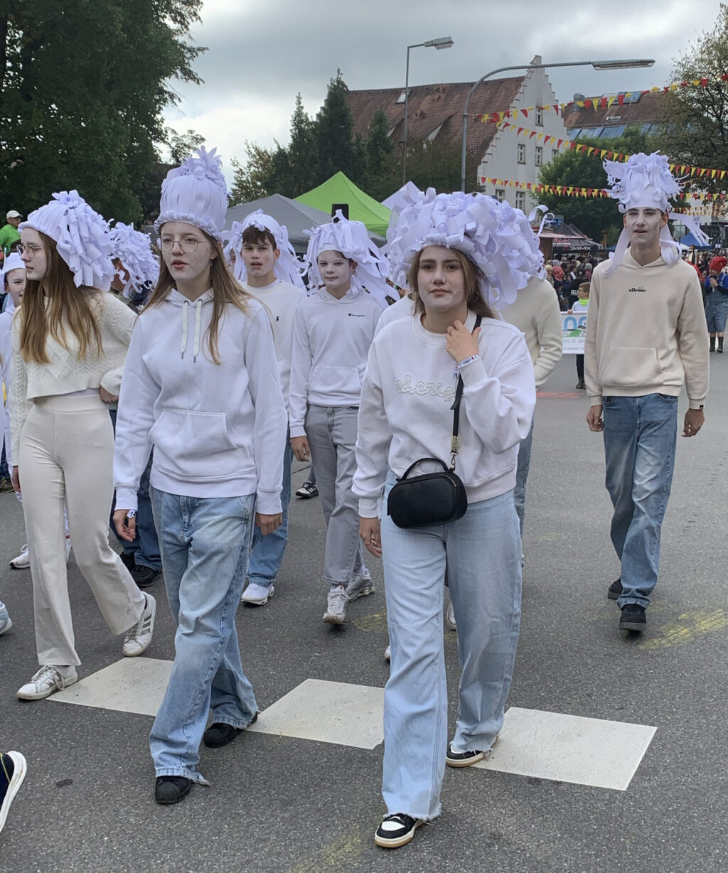 Der lang gehegte Wunsch der Aulendorfer, mal wieder einen Umzug durch ihr Städtchen erleben zu dürfen, ging an diesem Festtag in Erfüllung. Etwa 1500 Ehrenamtliche boten einen Umzug, auf dem Geschichte und Geschichten der Stadt und zugleich auch die heutige Breite ihrer Möglichkeiten zu sehen war. 50 Gruppen zogen durch die Hauptstraße zum Schloss, sogar unterstützt von Bad Waldsee und Molpertshaus. Angeführt wurde der Umzug von einem Wagen mit großformatiger Vergrößerung der Stadtverleihungsurkunde, dem der Wagen mit Bürgermeister und Gemeinderat folgte. Gruppen aus allen Kindergärten, der Klassen der Grundschule und des Studienkollegs St. Johann präsentierten Beispiele ihrer aktuellen Schwerpunkte. Fehlen durften natürlich nicht die Stadtkapelle, auch nicht die Bad Waldseer, Fanfarenzüge, die Narrenzunft, Gräfin Paula zu Königsegg-Aulendorf mit Zofe in weißer Kutsche, vierspännig gezogen, die Blutreitergruppe, die Gruppen aus den Teilorten wie beispeilsweise die Tannhauser Torfstecher und Fanfarengruppe oder die sieben Zwerge aus Blönried, unter ihnen natürlich Hartmut Holder. Eine Gruppe bestand ausschließlich aus Vertretern des Jahrgangs 1950! Sehr humorvoll kommentierte Michael Weißenrieder jede vorbeiziehende Gruppe.