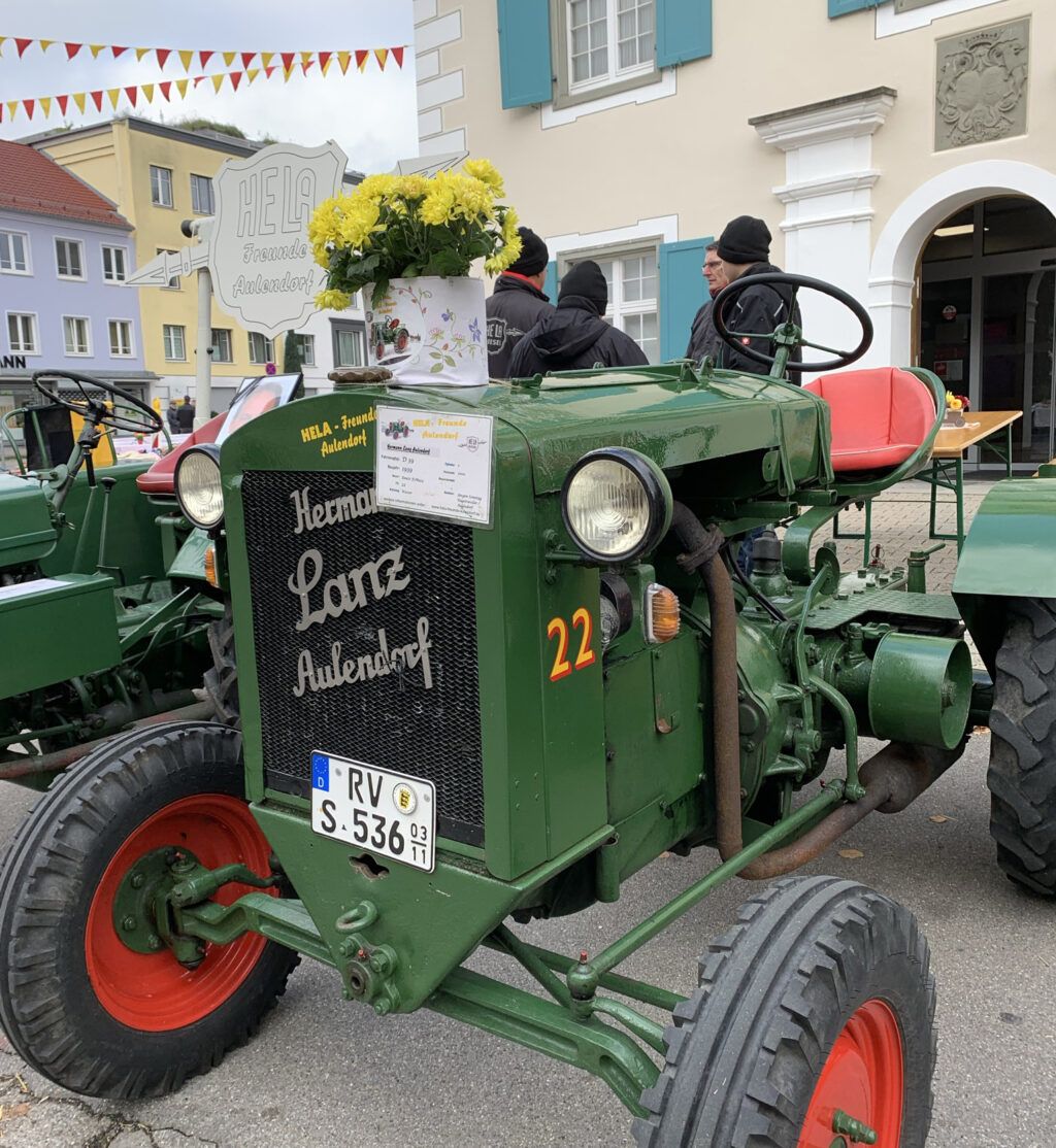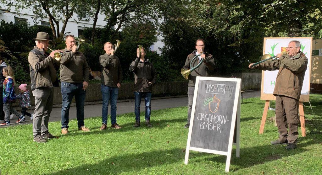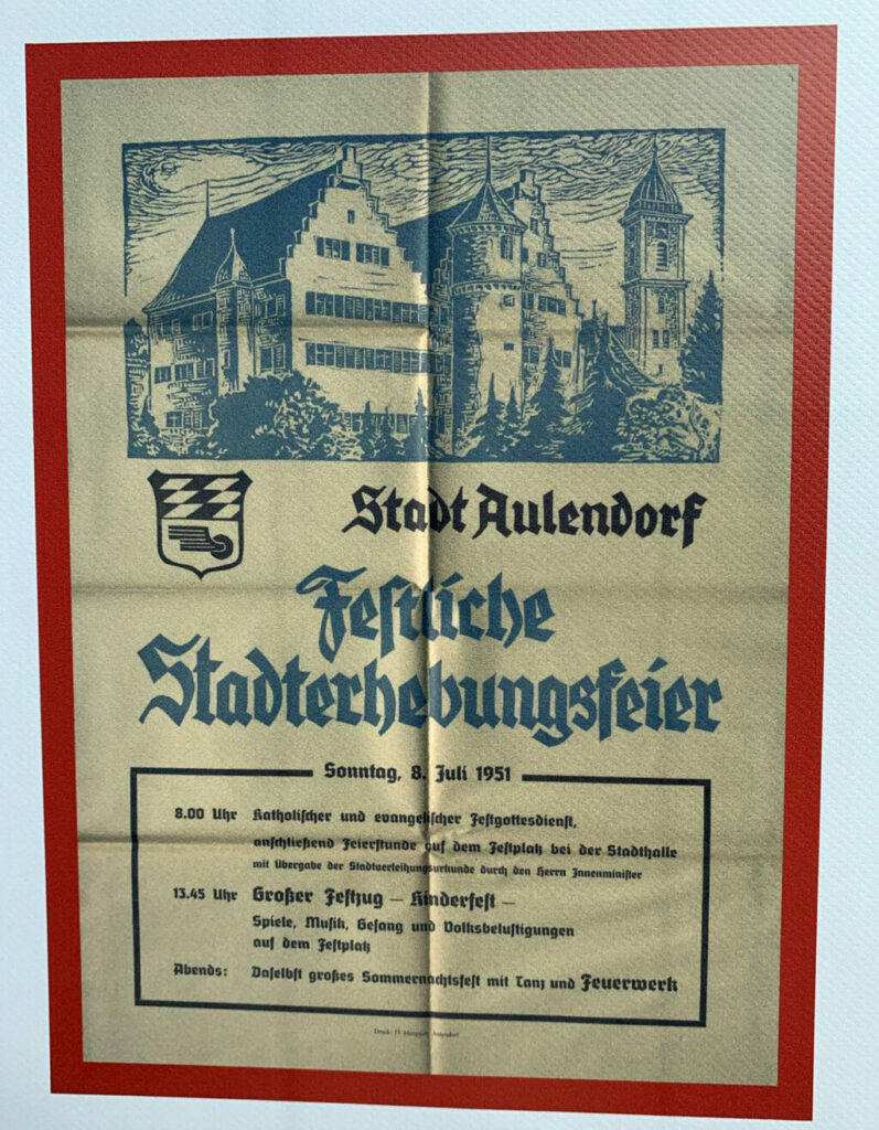 Nach dem Gottesdienst gab es Gelegenheit, den zum Festplatz umfunktionierten Schlossplatz samt Hauptstraße zu besuchen. An großen Tafeln war die Geschichte der bisherigen Stadt-Ära zu betrachten. Die Freiwillige Feuerwehr, ein Simulator, ein Stadtcafé und die Festbühne waren bereit. Eine Jagdhornbläsergruppe erläuterte die Bedeutung der verschiedenen Signale, teilweise gar mit Echo aus dem Wald. Zwischen Hofgarten und Schloss waren lange Reihen Original-Aulendorfer Hela-Traktoren, The Junkers präsentierten super gepflegte US-Straßenkreuzer und der BMW-Club Röhren seine getunten Geräte. Vor der Bühne waren lange und festlich geschmückte Tischreihen, die später komplett besetzt waren.