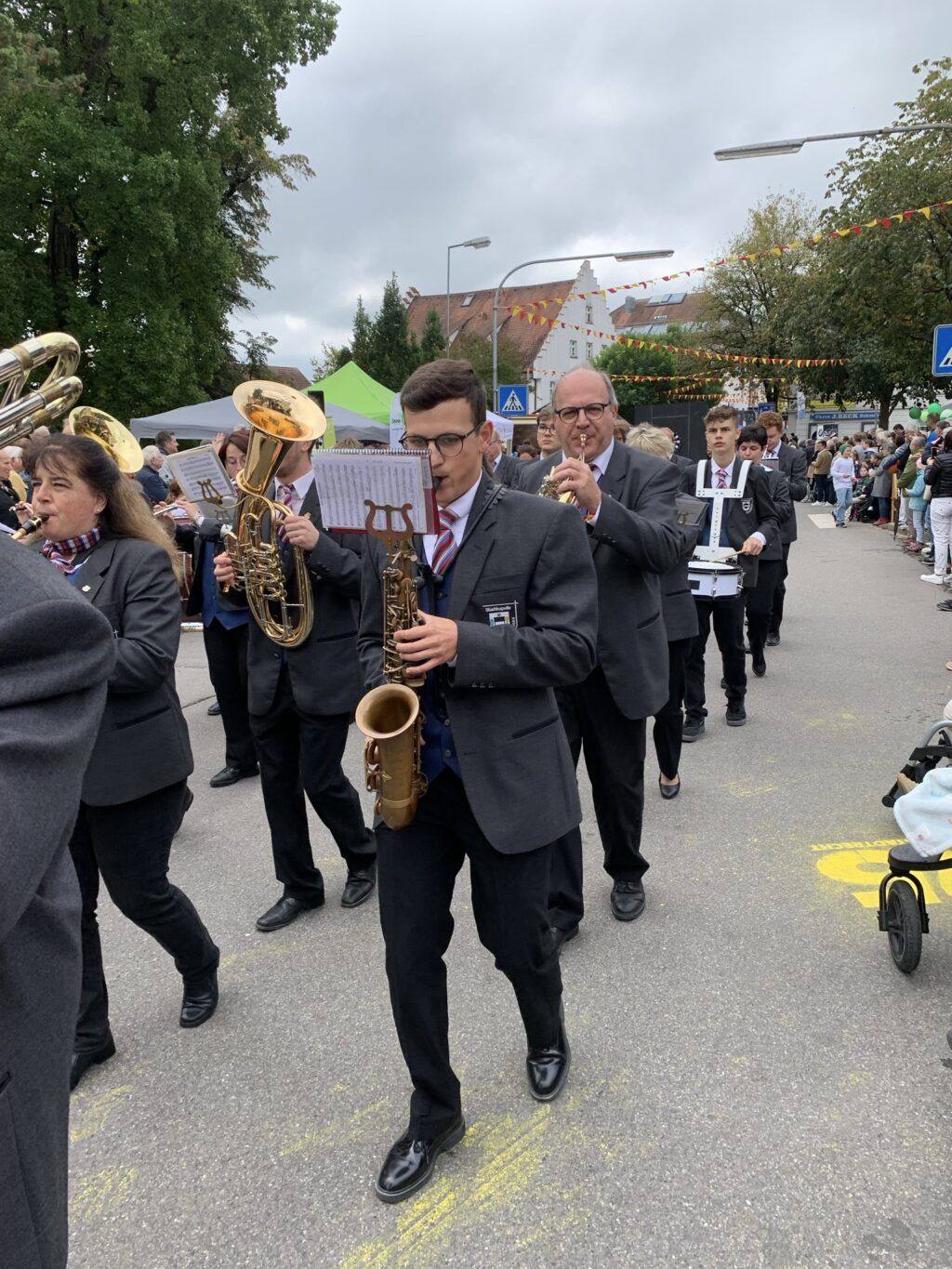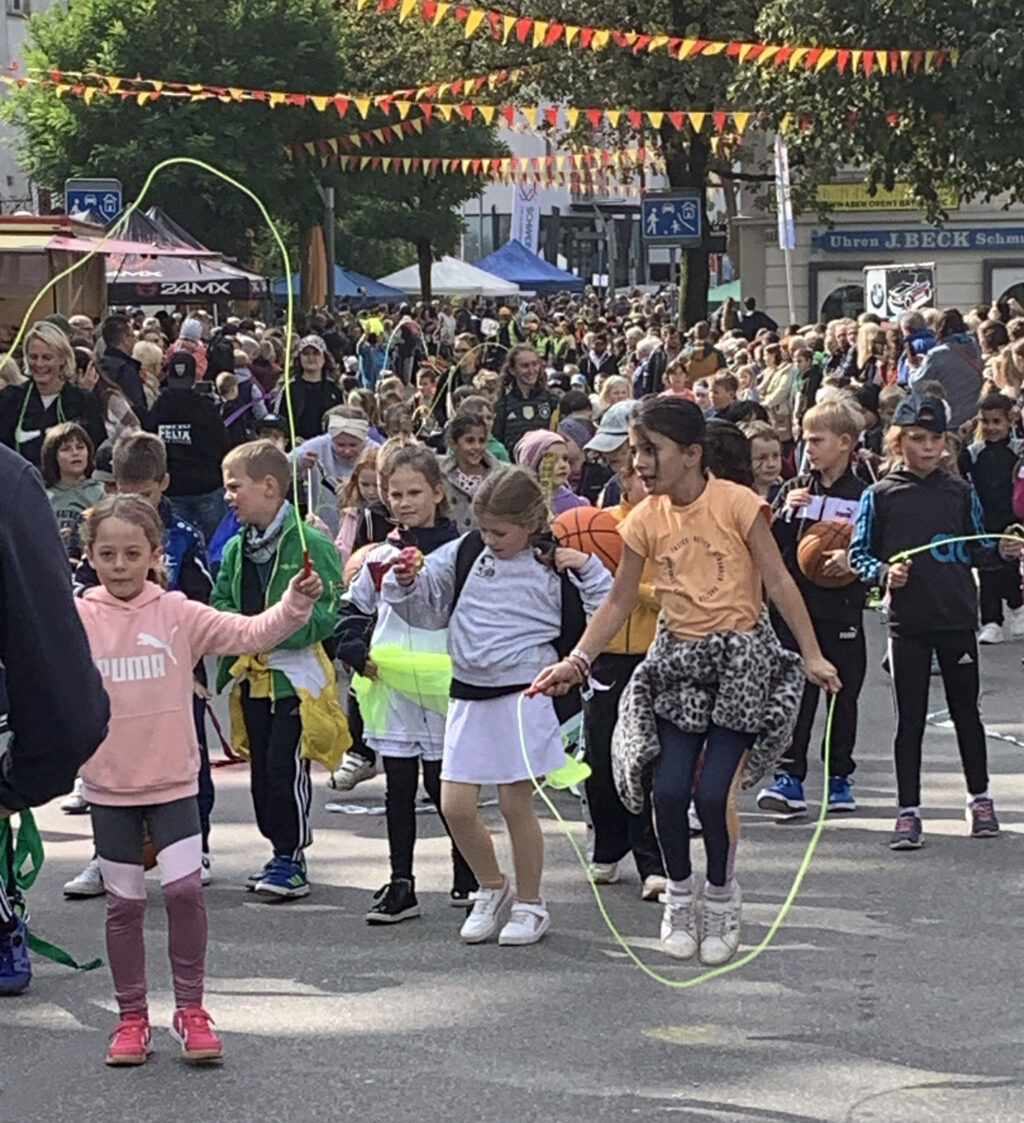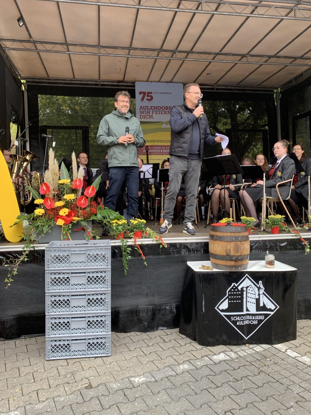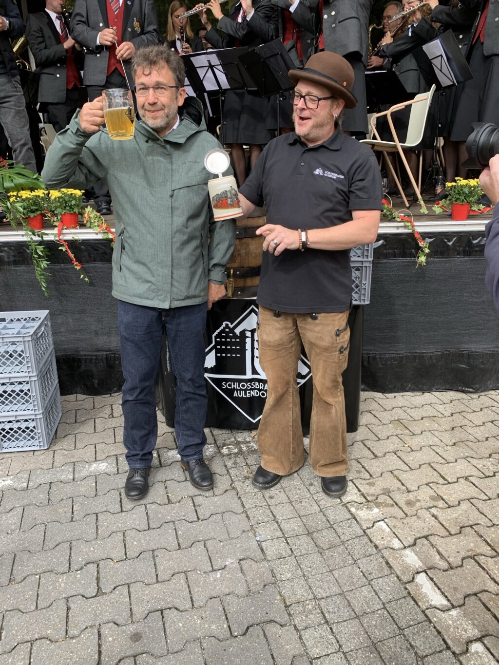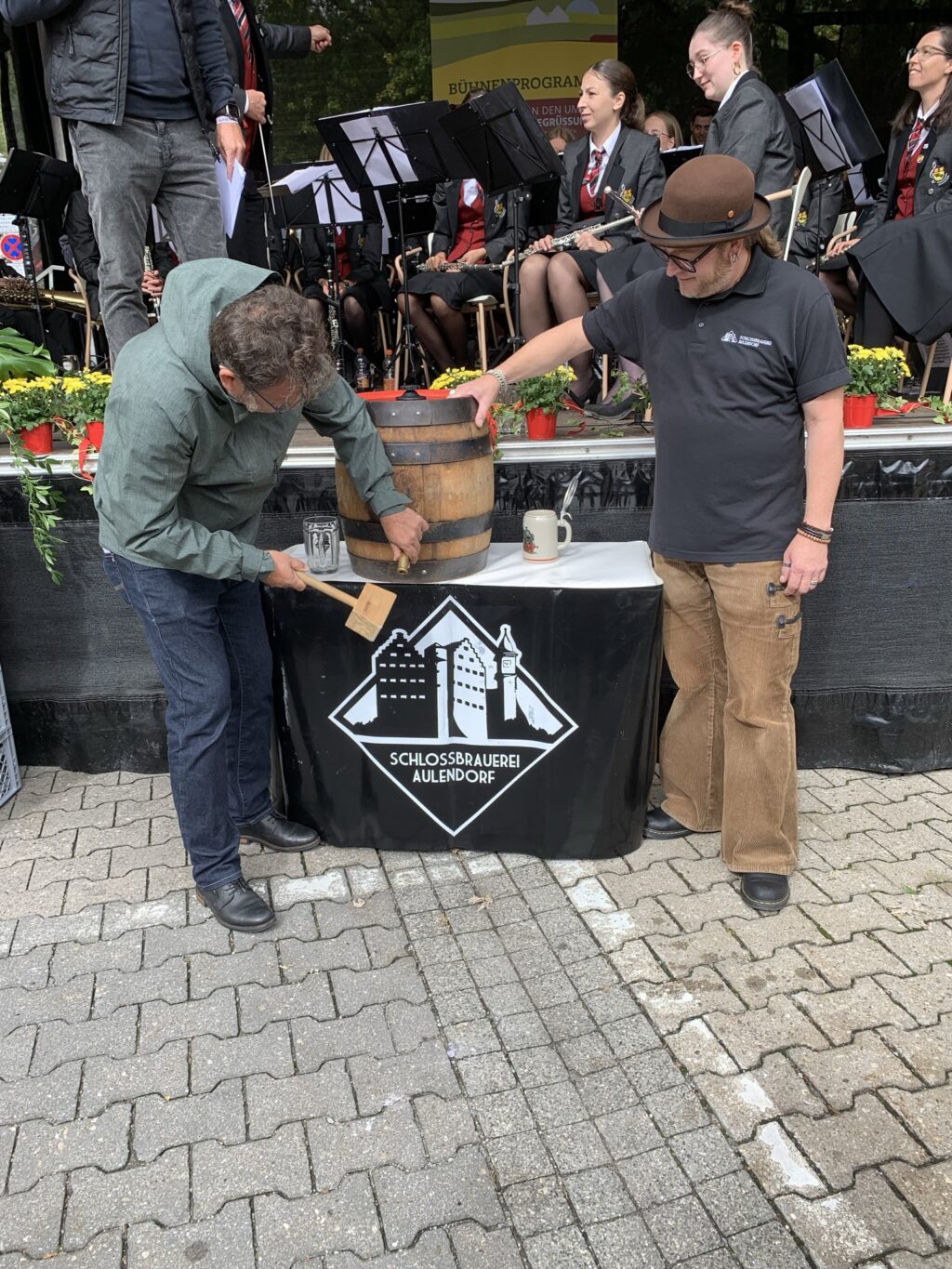 Nun war es Zeit für Auftritte auf der Festbühne, wo bis zum Schluss des Festtages beste Unterhaltung geboten war. Die Stadtkapelle unter neuer Leitung von Hermann Stehle spielte gleich zu Beginn auf. Michael Weißenrieder und Braumeister Flo Angele kamen hinzu, um den Fassanstich ihres Bürgermeisters standesgemäß vorzubereiten. Nach heiteren Wortwechseln zwischen den Beiden kam die Aufforderung „hau en nei, dr Zapfa!“ Die nachsichtige Zählung der Schläge kam zum Ergebnis: „Eins“! Von der Stadtkapelle wurde das mit einem erlösenden „Prosit der Gemütlichkeit“ gewürdigt. Keine ausschweifende Jubiläumsrede war geplant. Stattdessen dankten Weißenrieder und Angele den vielen Vorbereitern und Helfern zu diesem Festtag. Silke Johler und Mirella Bachmann wurden für ihr Engagement bei der Dekorierung der Stadt und für Organisatorisches mit einem Blumengebinde geehrt.