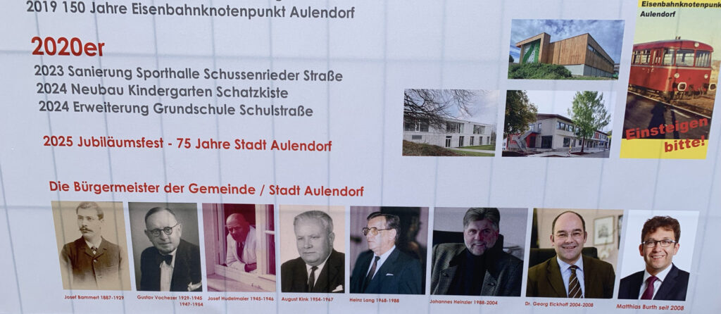Die Bürgermeister Aulendorfs der letzten 138 Jahre: Josef Bammert (1887 – 1929), Gustav Vochezer (1929 – 1945 und 1947 – 1954), Josef Hudelmaier (1945 – 1946), August Kink (1954– 1967), Heinz Lang (1968 – 1988), Johannes Heinzler (1988 – 2004), Dr. Georg Eickhoff (2004 – 2008) und Matthias Burth (seit 2008).