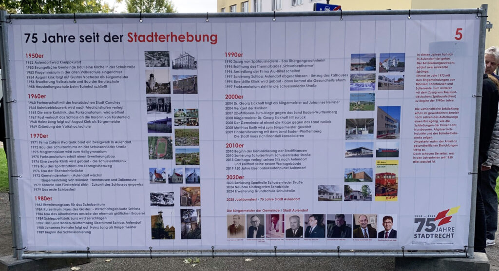 Aulendorf – Auf Plakaten im gesamten Stadtgebiet war es seit Wochen zu lesen: „Aulendorf, wir feiern dich“. Somit war es spannend, wie die Menschen dieser Stadt am 28. September des Jahres 2025 die 75 Jahre Stadterhebung feiern würden. Selbst das Datum der Feier war optimal gewählt, denn das Grau und die Nässe der vergangenen Tage wich einer standesgemäßen Aufheiterung mit zeitweisen Sonnenstrahlen. Ein ökumenischer Gottesdienst eröffnete den Festtag mit Jubiläumsumzug, Fassanstich, verkaufsoffenem Sonntag, einer Leistungsschau ortsansässiger Betriebe, viele Mitmachaktionen, an vielen Stellen gab es Deftiges, Süßes und Flüssiges. Und zudem lockte ein Mittelaltermarkt zwischen Hotel Arthus und Herrenmühle. Vermutlich waren wohl fast alle Aulendorfer, ergänzt durch auswärtige Fans, auf dem Fest.