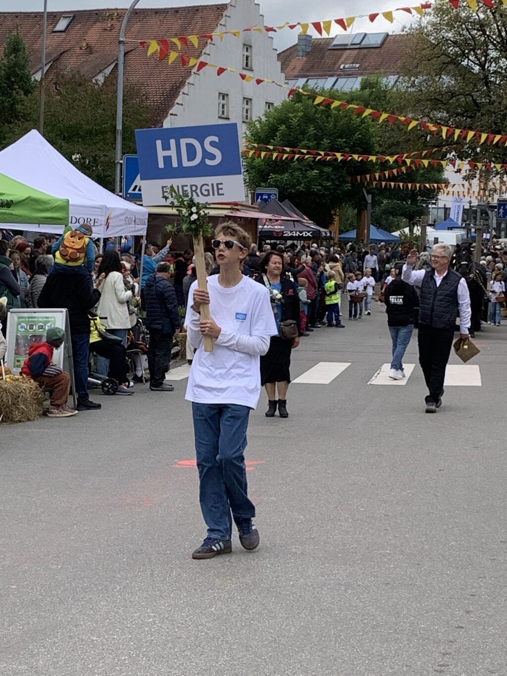 Nach dem Gottesdienst gab es Gelegenheit, den zum Festplatz umfunktionierten Schlossplatz samt Hauptstraße zu besuchen. An großen Tafeln war die Geschichte der bisherigen Stadt-Ära zu betrachten. Die Freiwillige Feuerwehr, ein Simulator, ein Stadtcafé und die Festbühne waren bereit. Eine Jagdhornbläsergruppe erläuterte die Bedeutung der verschiedenen Signale, teilweise gar mit Echo aus dem Wald. Zwischen Hofgarten und Schloss waren lange Reihen Original-Aulendorfer Hela-Traktoren, The Junkers präsentierten super gepflegte US-Straßenkreuzer und der BMW-Club Röhren seine getunten Geräte. Vor der Bühne waren lange und festlich geschmückte Tischreihen, die später komplett besetzt waren.