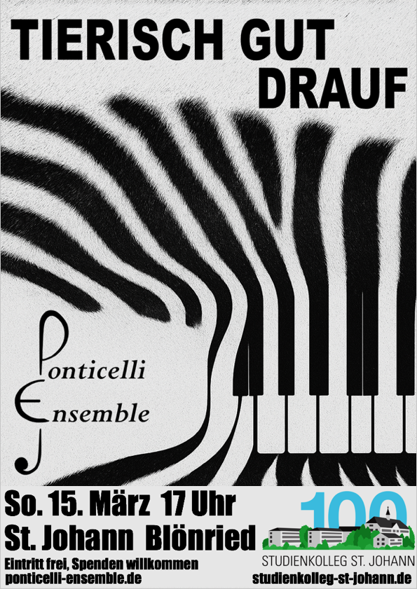 Blönried – Im 100-jährigen Jubiläumsjahr öffnet das Studienkolleg seine Türen zur nächsten Jubiläumsveranstaltung: Das Ponticelli Ensemble spielt am Sonntag, 15. März, um 17.00 Uhr, in der Kulturhalle unter dem Motto „Tierisch gut drauf!“ – ein musikalischer Streifzug voller Eleganz, Energie und überraschender Tierbegegnungen.