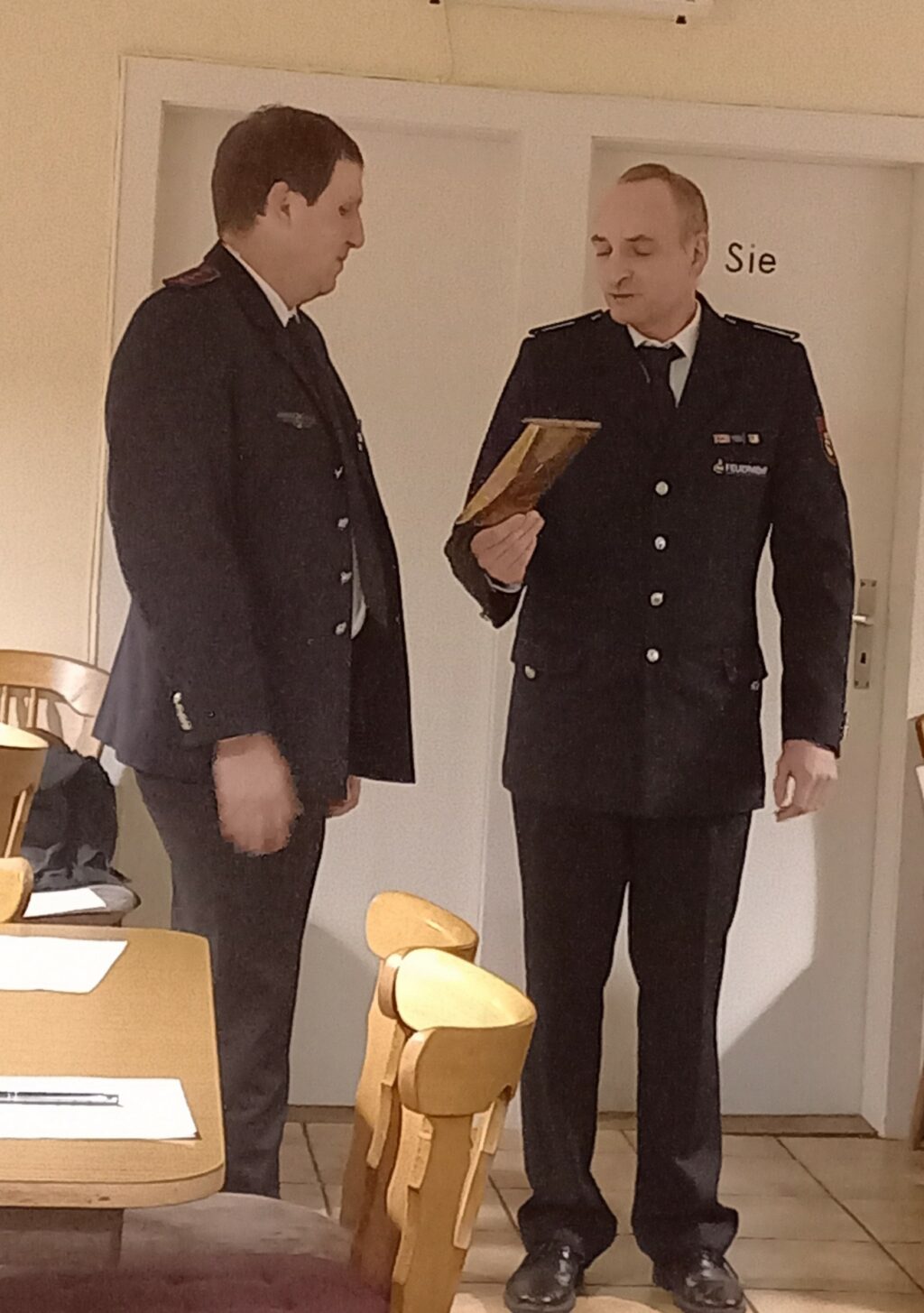 Der Tagesordnung folgend, erhielt der Bürgermeister vom moderierenden Kommandanten das Wort. In seiner Ansprache wünschte der Bürgermeister gute Erholung in den noch verbleibenden bzw. in den bereits verstrichenen freien Tagen nach Weihnachten. Als Denkanstoß für das kommende Jahr erzählte Matthias Burth eine Geschichte, die im Wesentlichen darauf abzielt, sich auch mit kleinen Dingen zufriedenzugeben und sich auf das Wesentliche zu freuen.