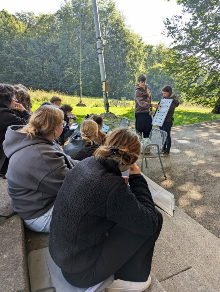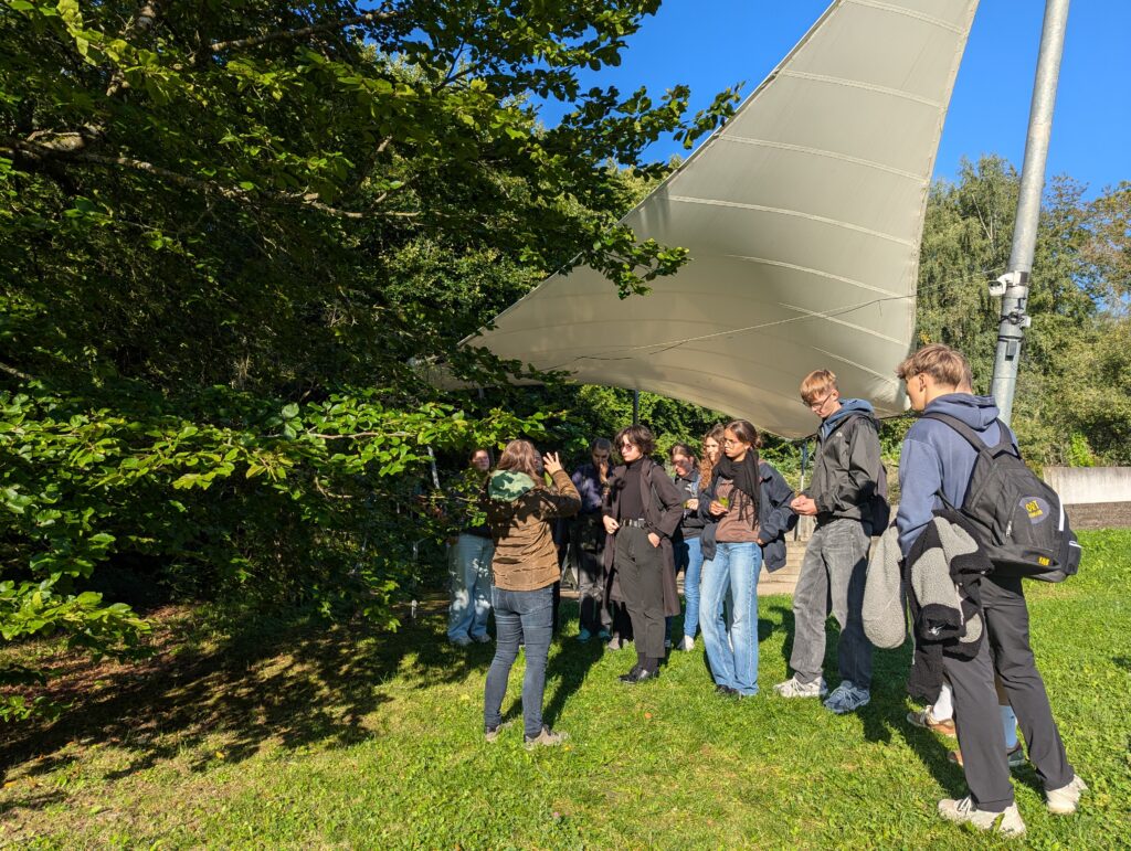 Am Vormittag besichtigten wir den Talking Tree BERTI, eine Rotbuche, die mit den verschiedensten Messgeräten ausgestattet ist. Die Sensoren geben live Daten an eine Plattform weiter. Durch die Auswertung dieser Daten konnten wir Prozesse, die wir zuvor im Unterricht theoretisch behandelt hatten, in der Praxis erleben. Zum Beispiel können die lokalen Folgen des Klimawandels anhand von BERTI mitverfolgt werden. So bekamen wir einen viel stärkeren Bezug zur Ökologie. Unsere Mittagspause verbrachten wir mit Sonnenschein und leckerem Mittagessen im Biergarten. Frisch gestärkt und erholt ging es dann in den zweiten Teil unserer Exkursion.