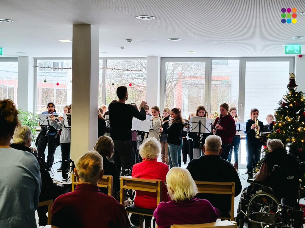 Unter der Leitung von Steffen Ocker und Christof Lang spielte die Bläserklasse 6 vier Weihnachtslieder, die im Foyer des Wohnparks weihnachtliches Flair verbreiteten. Manche Seniorinnen und Senioren ließen es sich nicht nehmen und sangen leidenschaftlich mit. Nach einer kurzen Zugabe verabschiedeten sich die Musikerinnen und Musiker mit Punsch und Lebkuchen.Vielen Dank für die nette Bewirtung. Vielleicht schaffen wir es auch im nächsten Jahr wieder, ein kleines Konzert zu geben.
