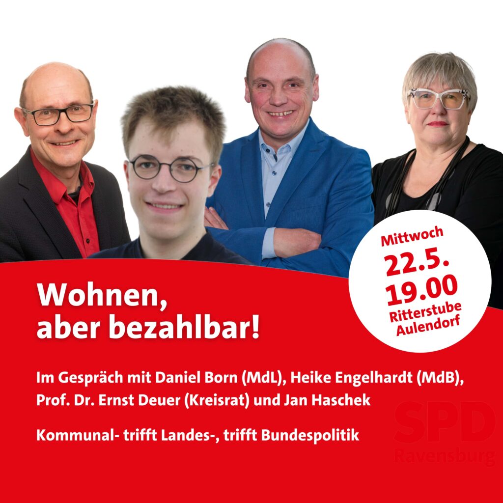 Aulendorf – Um bezahlbaren Wohnraum geht es beim Bürgergespräch der SPD am 22. Mai im Ritterkelller (19.00 Uhr). Hier der Pressemitteilung der SPD: