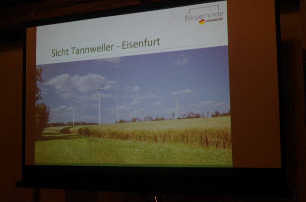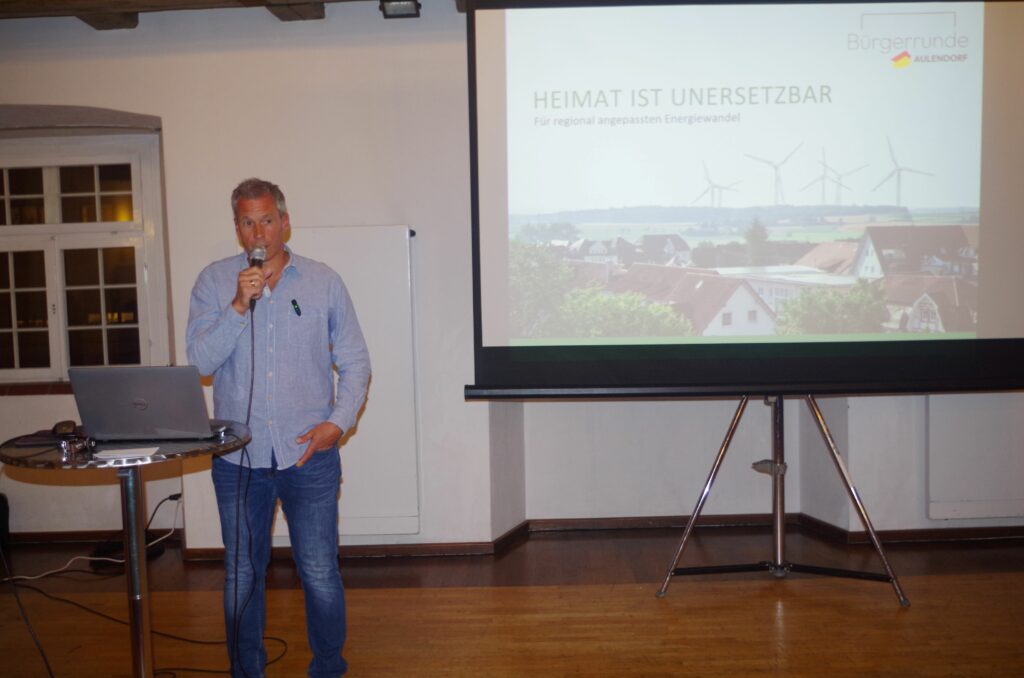 Aulendorf – Die „Bürgerrunde Aulendorf“, die im Frühjahr in der Ortschaft Tannhausen gegründet wurde, veranstaltete am vergangenen Donnerstag (26.9.) einen Informations- und Vortragsabend im Hofgartensaal. Es ging um die Windkraft im Bereich Aulendorf, insbesondere um den geplanten Windpark im Gebiet „Aulendorf Ost“ und seine zuletzt geplante Erweiterung von vier auf neun Windräder. Als Referenten hate die Bürgerrunde den Betriebswirt Thorsten Müller vom Netzwerk Naturschutz Allgäu-Oberschwaben eingeladen.