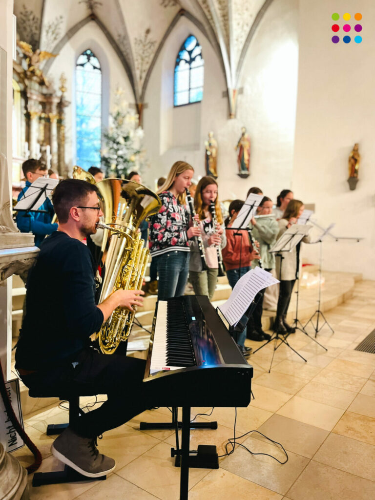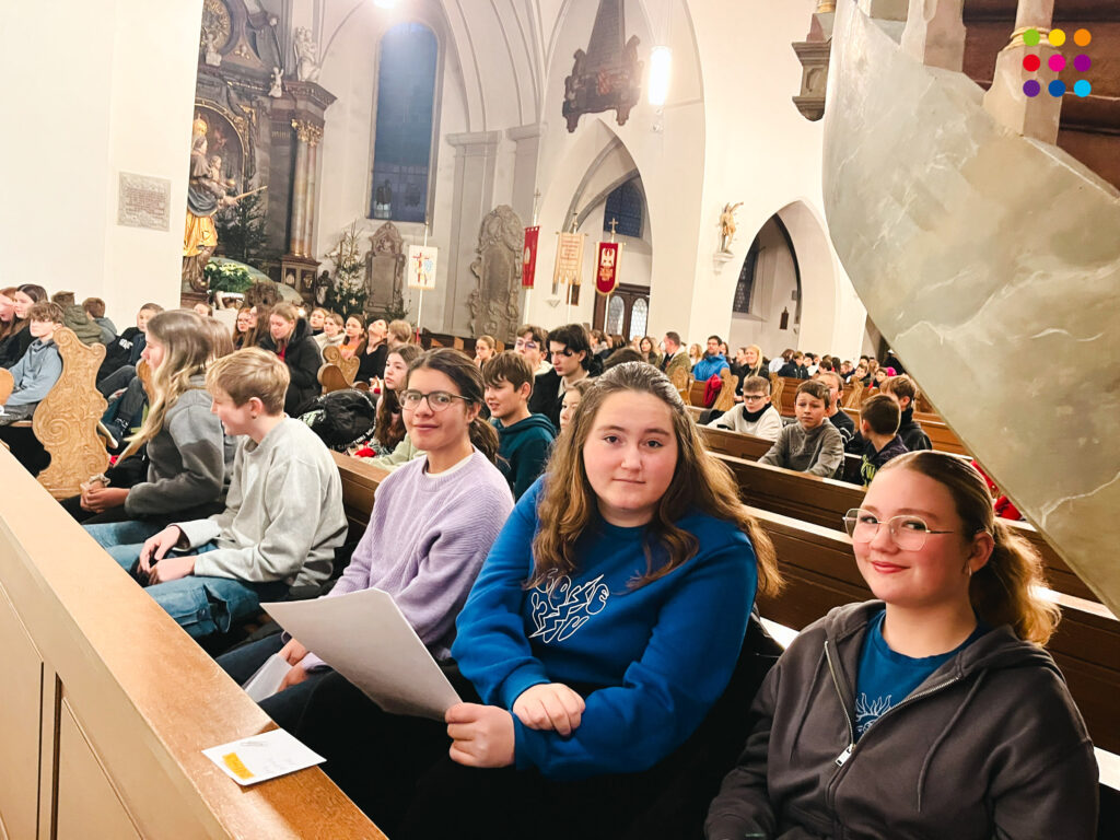 Aulendorf – Am letzten Schultag fand in der vollbesetzten katholischen Kirche St. Martin der Weihnachtsgottesdienst beider Schulen des Schulzentrums statt. Unter dem Motto „Hoffnungslichter“ wurde, federführend von Birgit Schmogro und den Religionsklassen der Schule am Schlosspark, Frau Daniela Mangold und dem Gymnasium, ein Gottesdienst für SchülerInnen, LehrerInnen und interessierte Gäste gestaltet. Musikalisch begleitet wurde der Gottesdienst von der Bläserklasse 6 unter der Leitung von Musiklehrer Steffen Ocker.
