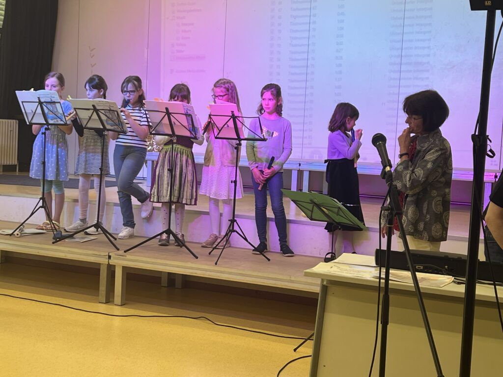 Die Flöten- und Oboenschülerinnen von Dietlind Zigelli folgten mit einer vielfältigen Auswahl an Liedern, darunter bekannte Stücke sowie weniger bekannte Melodien. Anschließend präsentierten die Trompeten- und Hornschülerinnen und -schüler von Severin Hänßler fünf Musikstücke.