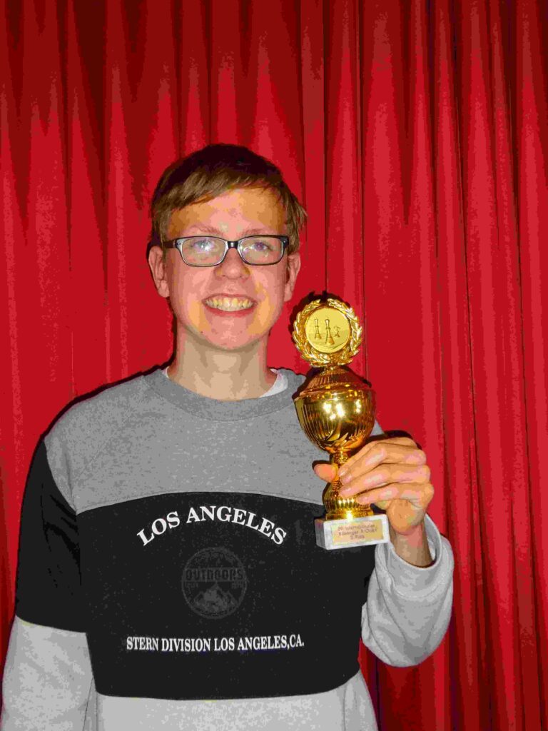Gut einhundert Teilnehmer waren im höchsten „A-Turnier“ am Start – und ganz vorne dabei der Aulendorfer Marius Deuer. Mit seinen 15 Jahren war er nicht der jüngste Teilnehmer, aber stattdessen aufgrund seiner Spielstärke einer der absoluten „jungen Wilden“. Einen „Ehrenpreis“ erhielt ein 88jähriger Teilnehmer, der im B-Turnier beachtliche 6 aus 9 möglichen Punkten holte. Marius Deuer holte 7 von 9 Punkten im A-Turnier und damit den 3. Platz in der höchsten Spielklasse.