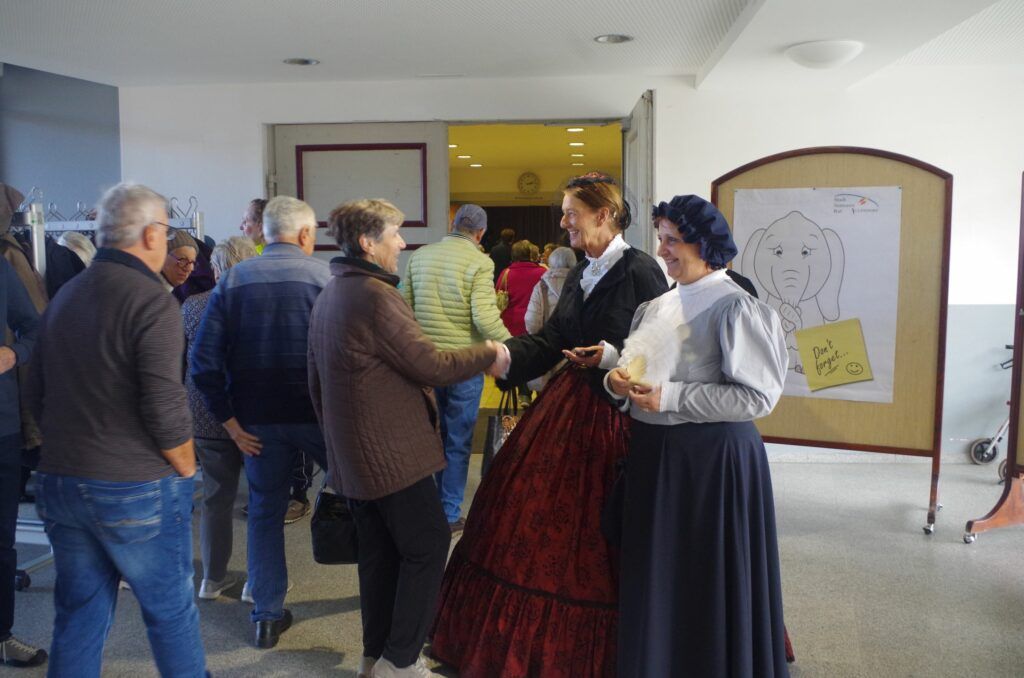 Aulendorf – Am Eingang begrüßen “Gräfin Paula” und ihre “Zofe” die Gäste. Erstmals hatte die Stadt Aulendorf zu einem Herbstfest für Seniorinnen und Senioren im Alter von 70 plus in die Stadthalle eingeladen. 400 Bürgerinnen und Bürger diese Altersgruppe hatten sich angemeldet: Einige mehr waren gekommen und hatten die Stadthalle bis auf den letzten Platz gefüllt.