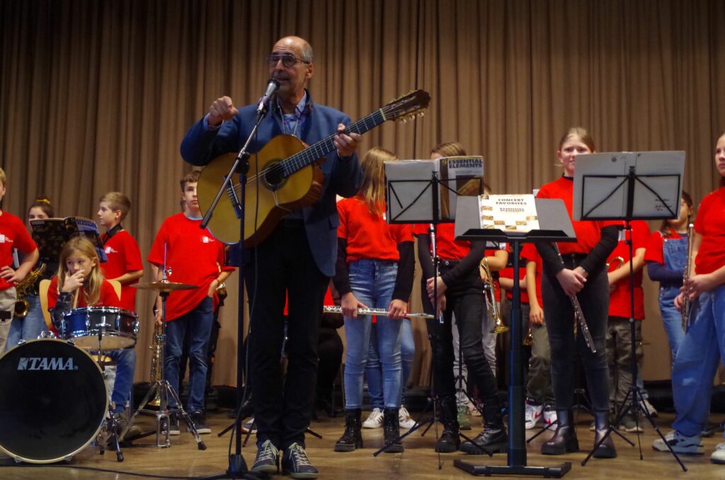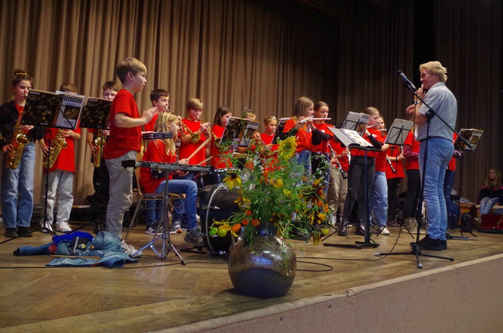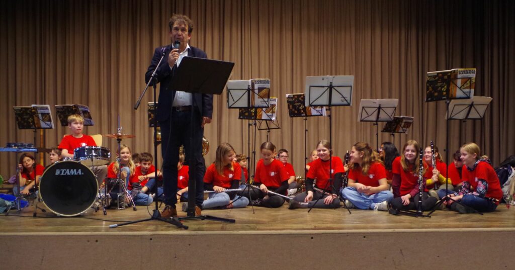 Dann übernahm die Bläsergruppe der Klasse 5 und 6 unter Leitung von Rektor Christof Lang das Programm und spielte „Ode an die Freude“ von Ludwig van Beethoven. Stellvertretend für die Gruppe gab Florian dem Moderator Bitterwolf Auskunft, dass er seit einem Jahr Trompete lerne, zweimal die Woche werde geprobt und es mache natürlich Spaß, sagt er. Rektor Lang ergänzte, jedes Kind sollte die Möglichkeit haben, ein Instrument zu lernen. Die Instrumente werden für eine geringe Gebühr ausgeliehen und die Kinder sind stolz und entwickeln Selbstbewusstsein, wenn sie wie im vollen Saal der Stadthalle mit Applaus belohnt werden.