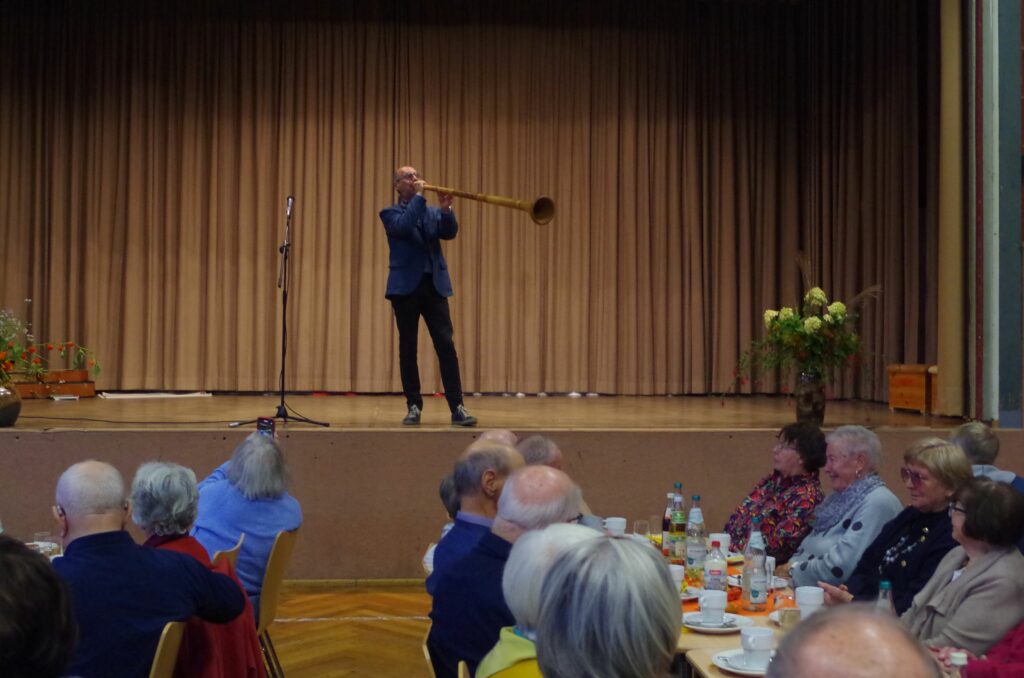Die nächste Stunde diente dem “Hoschtuben”. Bitterwolf unterbrach dann und wann die Gespräche, spielte auf einem unbekannten bäuerlichen Instrument, das wie ein Alphorn klingt. „Singen ist gesund“, animierte er das Publikum zum Singen ohne Text, nur die Melodie, während sein ehemaliger Musikdirektor Friedl Schoch und der Bürgermeister im Wettstreit das Lied erraten sollen. Die Aufgaben waren nicht so schwierig, von „Auf der schwäbischen Eisenbahn“, “Hoch auf dem gelben Wagen“ bis „Alle Vögel alle“ wurden sie leicht erraten.