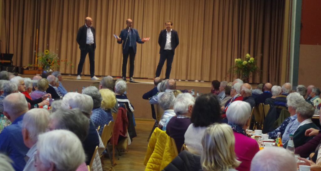 In seiner Rede zur Begrüßung zählte der Bürgermeister die Angebote in Aulendorf auf: Seit zehn Jahren gibt es den offenen Mittagstisch der Katholischen Kirchengemeinde, die Solidarische Gemeinde mit Offenem Bürgertreff hält Angebote bereit (siehe dazu auch Bericht Spielenachmittag bei uns in der Bildschirmzeitung), der Stadtseniorenrat ist mit seiner offenen Sprechstunde donnerstags auf dem Markt erreichbar und bietet Kino, Handarbeiten, Malen, Smartphonehilfe und – neu – auch Gedächtnistraining für Senioren an. Ein ganz tolles Angebot sei auch das ärztliche Primärversorgungsnetzwerk von Dr. Schmidt in der Hauptstraße mit monatlicher Sprechstunde von Sandra Göttel vom Pflegestützpunkt. Bei dieser Gelegenheit informierte Burth über den Stand des neuen Ärztehauses von Dr. Schmidt und seinem Planungsbüro. Man sei mitten im Verfahren des Bebaungsplanes, der voraussichtlich Mitte nächsten Jahres im Gemeinderat verabschiedet werde. Einen konkreten Baubeginn zu nennen, wäre aber unseriös.