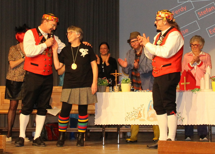 Der zweite Teil des Abends stand ganz im Zeichen des traditionellen Häsrichtens. Mit dem Häsrichterlied eröffneten Maria Arnold alias Traudl Prosecco, Conny Hörnle als Fräulein Kreszenzia, Sandra Nägle als S’ Nägele, Tina Heinemann als die Stuagertere, Irene Steinhauser als Frau Stoi, Carina Baur als Frau Bäurle und Britta Wekenmann-Arnold alias Hausmeister Bruno ihr Programm. Für besondere Freude sorgte der überraschende Auftritt von Gisela Weggenmann, die viele Jahre Teil der Häsrichtergruppe war.