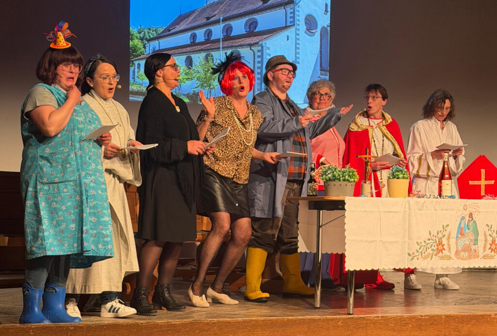 Auf der Bühne, die wie der Kirchenraum der Pfarrkirche St. Martin gestaltet war, spielten die Häsrichter humorvoll die größten Pannen und Missgeschicke des Jahres 2025 in Aulendorf nach – treffsicher, liebevoll und erstmals musikalisch begleitet von Ede Butscher an der Gitarre. Ob urkomische Beweisfotos oder kabarettistische Szenen: Das Publikum lachte, sang mit und fühlte sich bestens unterhalten.