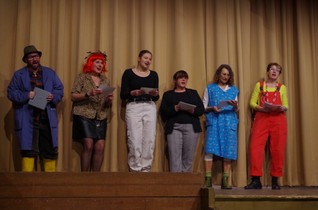 Nachdem sich Flo durch die Begrüßung kalauerte: „Bruno Sing, das grüne Ding, schee, dass du do bisch“ und die Band Dreixang mit Schunkelliedern (“Aulendorf zur Fasnetszeit, Heiterkeit und Trubel …”) die Umbaupause nach dem Tanz der Aulendorfer Hofpagen bis zum Häsrichten überbrückte, ging es los mit den Geschichten: Hond’r scho g’hört …?