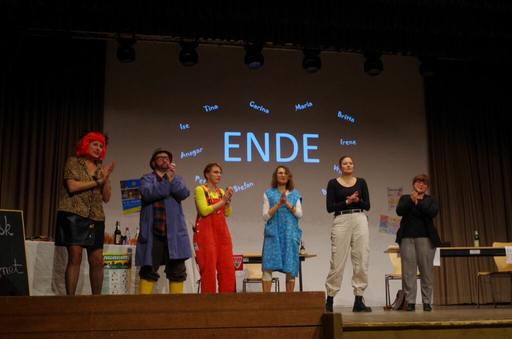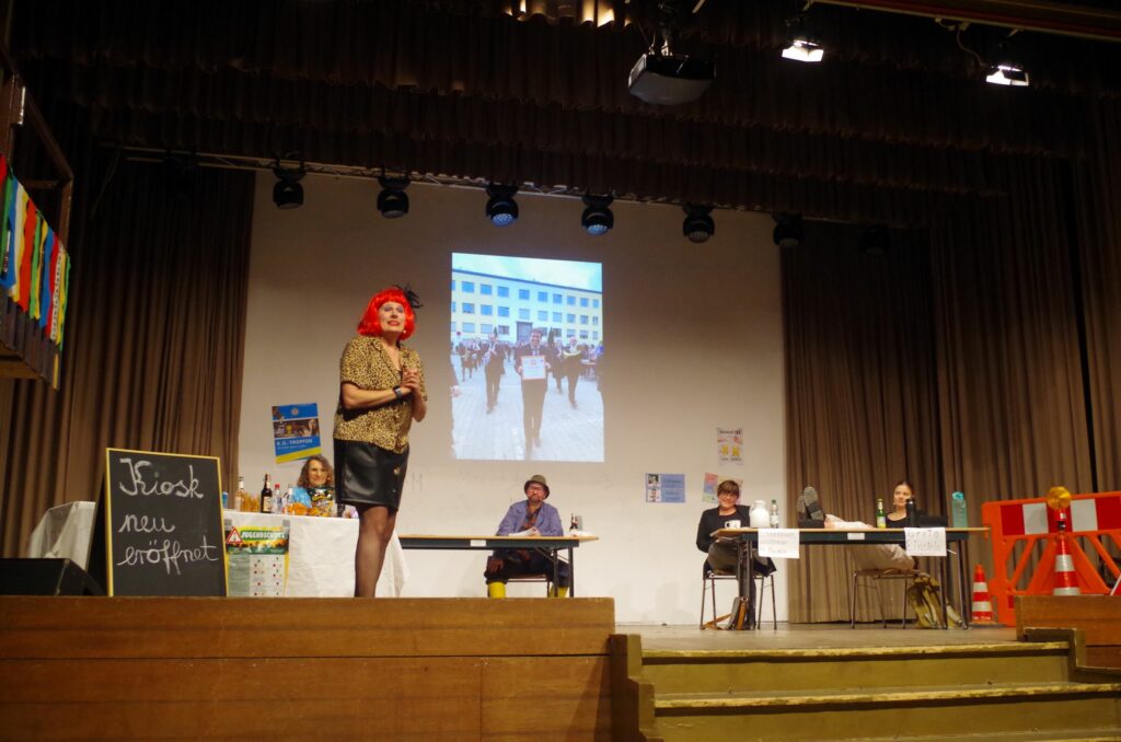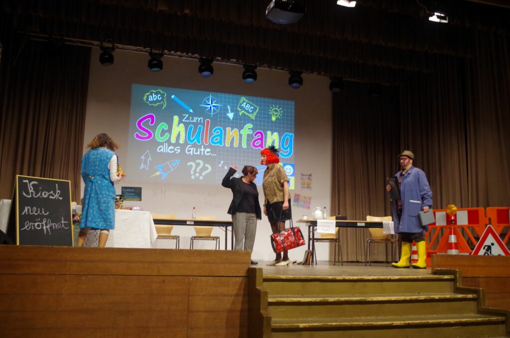 Die Bühnenkulisse zeigte eine Schule in Vorbereitung auf den Elternabend. Doch die Geschichten hatten kaum die Schule als Thema, allenfalls noch die Verwechslung von Apfelsaft und Apfelmost als Pausengetränk. Vielmehr ging es um das Schlossfest und das Ärgernis dabei, sein Auto in der Tiefgarage zu parken und den Hinweis „Rolltor schließt um 22 Uhr“ zu übersehen. Natürlich wurde auch der eine oder andere Fehler der Stadtverwaltung erzählt, so die Markierungen für den Flohmarkt. Statt diese rechtzeitig nach dem Fest zu entfernen, wurden sie weit vor dem Fest angebracht und sind nun noch länger ein Ärgernis einiger Anwohner.