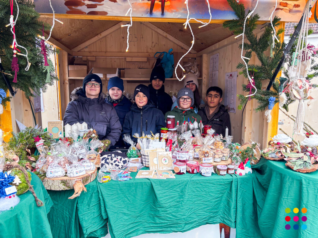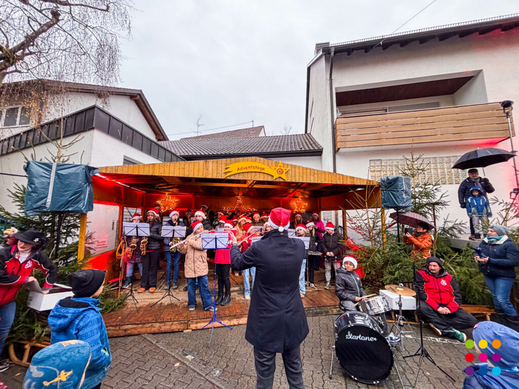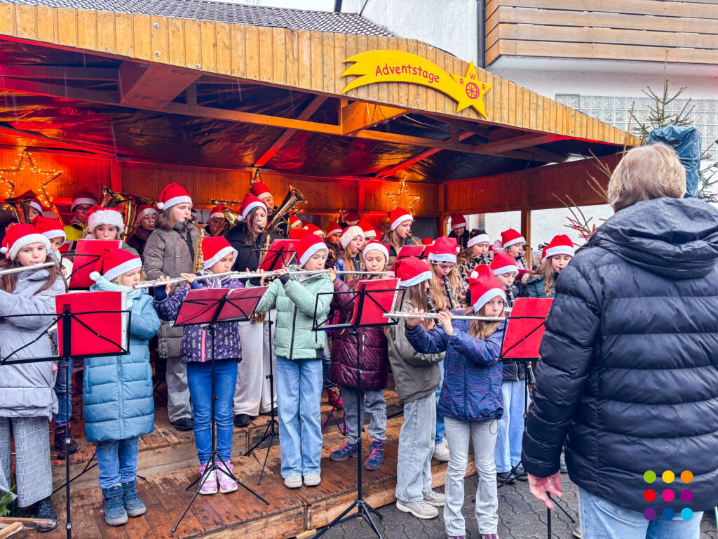 Bei wechselhaftem Dezemberwetter konnten sich die Besucher am Stand der Schule mit selbstgebackenen Plätzchen, kandierten Nüssen, Walnüssen und Selbstgebasteltem für die Vorweihnachtszeit eindecken. Der Erlös kam den Klassen 5 zugute. Beim traditionellen Kinderadvent am Sonntag traten die Bläserklassen 5 und 6 mit insgesamt rekordverdächtigen 95 Schülerinnen und Schülern unter der Leitung von Christof Lang und Steffen Ocker auf. Eröffnet wurde das Konzert von der Bläserklasse 5, die nach fünf Wochen Instrumentalunterricht ihre ersten 3 Stücke „Jingle Bells“, „Morgen kommt der Weihnachtsmann“ und „Doodle All Day“ dem begeisterten Publikum präsentierte. Nach einer Zugabe übernahm die Bläserklasse 6 mit ihrem weihnachtlichen Repertoire die Bühne. Nach 30 Minuten endete das Konzert.
