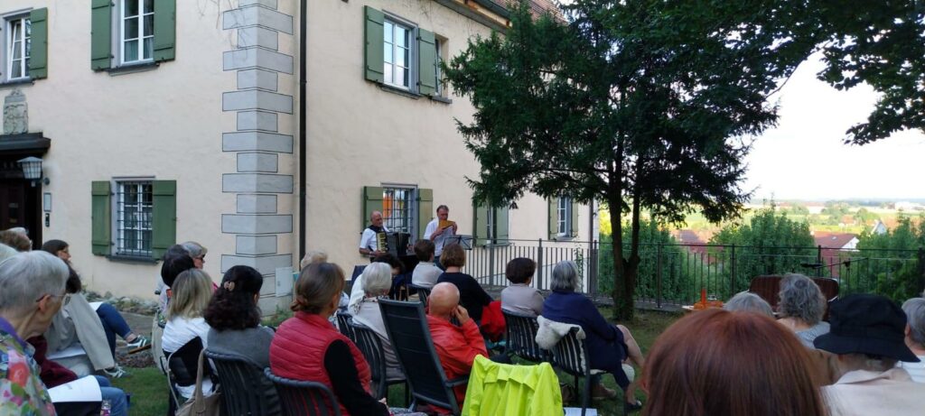 Aulendorf – Wenn die Nacht über Aulendorf hereinzubrechen beginnt, gehen die Fernseher an, dröhnen Automotoren laut auf und am Stammtisch kreist Weissbier. Nicht schön, aber wahr. Anders in jener stillen Ecke am Ende der Hauptstraße, gleich hinter der Pfarrkirche und vor dem großen Prospekt mit Hügeln, Landschaften und der vielfach beworbenen einzigartigen Atmosphäre oberhalb eines verschlossenen Gärtchens. Es ist ein Juliabend, die Temperatur mit 22 Grad über Null angenehm und die Wolken ziehen hoch und fern – vorbei. Die 4. Ausgabe der literarischen Soiree startete unter besten Bedingungen und mit einem dichten Programm rund um Bücher, Lyrik und Literatur im Allgemeinen.