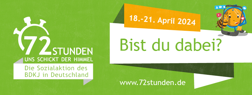 Die 72-Stunden-Aktion ist ein Sozialprojekt des Bundes der Deutschen Katholischen Jugend (BDKJ) und seiner Verbände und findet alle 5 Jahre statt. Unter dem Motto „Die Welt ein Stückchen besser machen“ werden in ganz Deutschland innerhalb von 72 Stunden verschiedenste Projekte umgesetzt. Diese greifen politische und gesellschaftliche Themen auf, sind lebensweltorientiert und können interreligiös, politisch, ökologisch oder international ausgerichtet sein. Die Gruppen setzen sich dazu in ihrem eigenen Sozialraum mit dem Ziel ein, die Welt für die dort Lebenden ein bisschen besser zu machen.