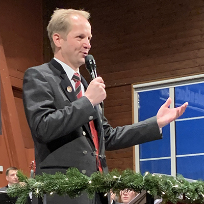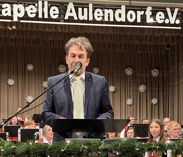 Teil II begann mit dem traditionellen Grußwort von Bürgermeister Matthias Burth (Bild). Er wünschte allen Aulendorfer Familien zum neuen Jahr Frieden und Zuversicht trotz weltweiter Krisen und Kriege. Statt Zukunftspessimismus sei doch Aufbruch angesagt. Als gutes Vorbild nannte er das inzwischen mehr als 160-jährige Wirken der Stadtkapelle, die Zusammenhalt, Rücksicht und Beständigkeit pflege. Was gibt denn Halt und was kommt auf uns alles zu, fragte der Bürgermeister. Nur Miteinander, Füreinander oder Zusammenhalt sei es! Burth nannte Beispiele aus dem nunmehr vergangenen Jahr: das Große Narrentreffen, das Schloss- und Kinderfest, 75 Jahre Stadterhebung und anderes mehr. Dies zeige doch, was mit ehrenamtlichem Engagement möglich ist. Beispielsweise habe die Stadtkapelle als Botschafterin unserer Stadt Verantwortung bewiesen, als sie sich für ein eigenes Probelokal stark machte oder gar die Tiefbauarbeiten im Zuge der Renovierung des Schloss-Innenhofs übernahm. Auch mit dem schmerzlichen Verlust ihres sympathischen Dirigenten Martin Rebmann musste sie lernen, umzugehen. Burth dankte auch Hermann Stehle für die nötig gewordene Übernahme des Taktstocks. Zum Abschluss seines Grußworts trug er das bis heute aktuelle und witzige Neujahrsgebet des Pfarrers von St. Lamberti in Münster aus dem Jahr 1883 vor, wofür er großen Beifall erntete.