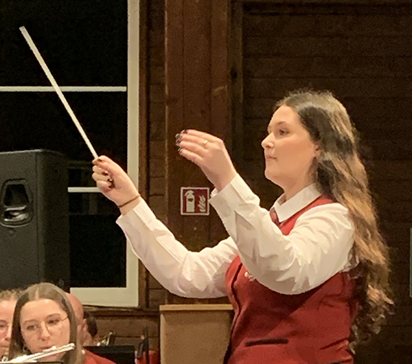 Finaler Schlusspunkt war dann eine Überraschung. Stehle räumte das Dirigentenpult und übergab den Taktstock der erst 18-jährigen Jungdirigentin des Vereins, Malenka Leser (Bild). Sie entstammt einer Aulendorfer Familie mit großer Musiktradition, erläuterte Dorner. Malenka durfte somit die zweite Zugabe dirigieren. Sehr sicher und konzentriert leitete sie die Komposition „Abendmond“ (Thiemo Kraas). Darin sind die Volkslieder „Abend wird es wieder“ und „Der Mond ist aufgegangen“ verschmolzen. Auch Malenka wurde mit starkem Applaus belohnt.