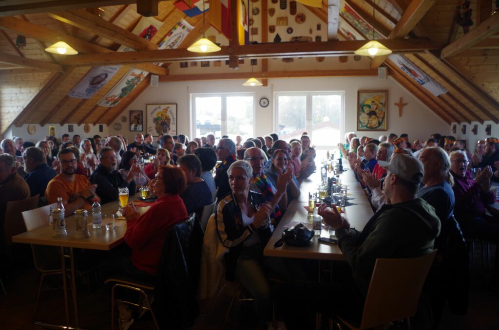 Das Motto lautet: „Mir feirat a schrillwildbunte Fasnetszeit in Hamburg mit Kiez, Alster und Großer Freiheit.“ Der Aulendorfer Pin, das Fasnetsabzeichen wird vorgestellt und die Ausfahrten der Zunft mit dem Bus zum Großen Narrentreffen in Weingarten und dem Umzug in die Nachbarstadt Bad Saulgau besprochen. Das Programm endet, als das Mittagessen mit Linsen, Spätzla und Saitenwürschd aufgetragen wird. Für die Stimmung sorgt weiter das Duo „Halb so schlimm“ alias Ede Butscher und Edwin Bentele mit Hits der letzten 70 Jahre.