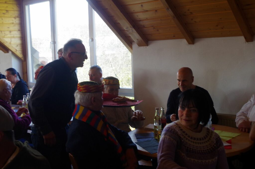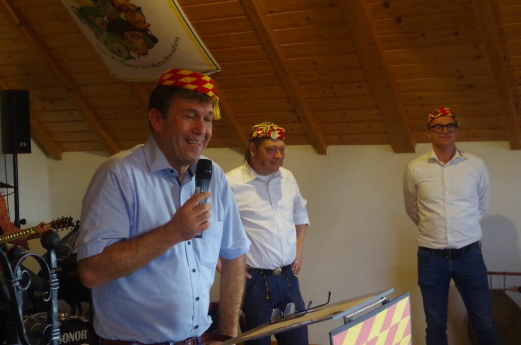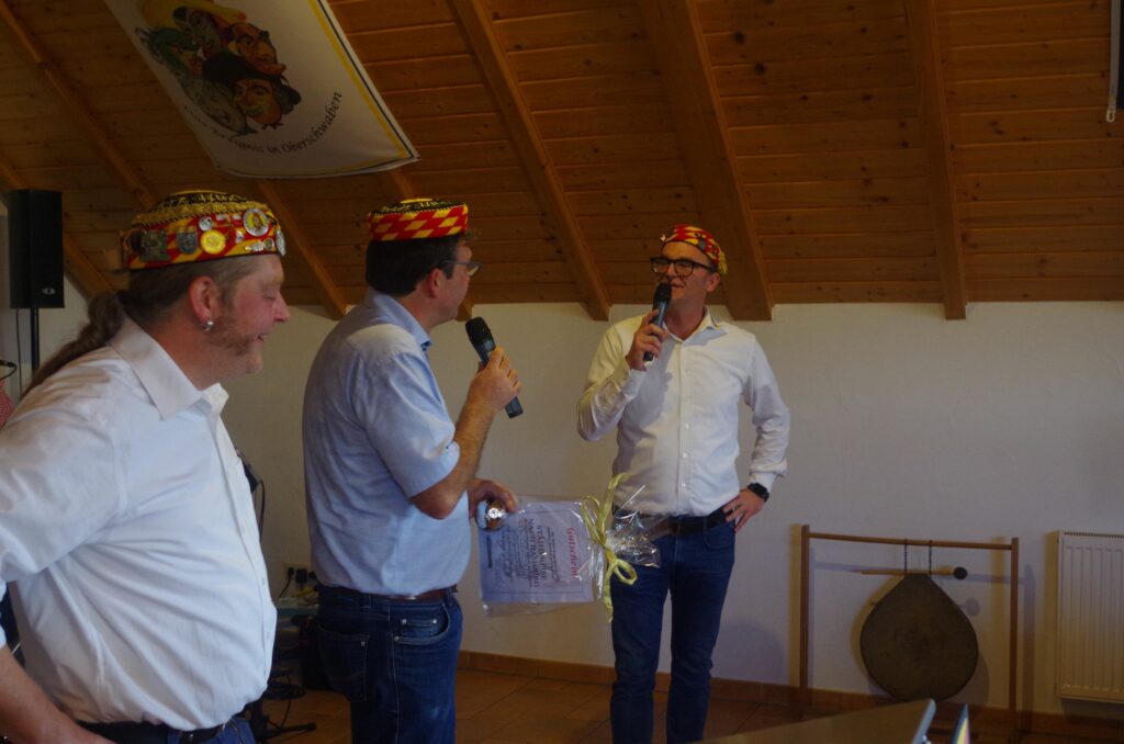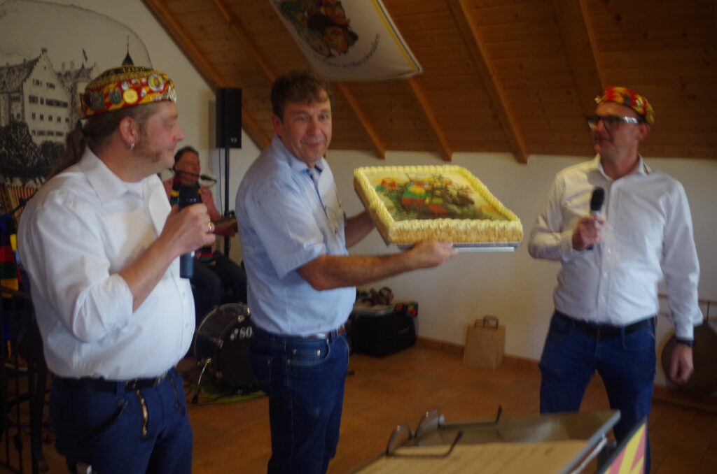 Wie immer hat er seine Narrenkappe vergessen und bekommt deshalb eine viel zu kleine Kappe verpasst. Andere Scherze sind, dass Flo sich über seine Geschenke, „selbst gebastelter Kruschd“ mokiert. Doch dieses Mal hat der Bürgermeister sich nicht lumpen lassen und eine Aulendorfer Fasnetstorte bei der Bäckerei Leser bestellt. Die ist so schwer, dass Burth und Angele ins Schwitzen geraten, diese zu halten, während sie der Ansprache des anderen zuhören müssen. Das Gegengeschenk ist ein Reisegutschein nach Hamburg, allerdings begrenzt auf den Fasnetstermin 2024 vom Gumpiga Donnerschtag bis zum Fasnetsende am folgenden Dienstag. Weiter folgt ein Scherz dem anderen und allen gefällt`s.