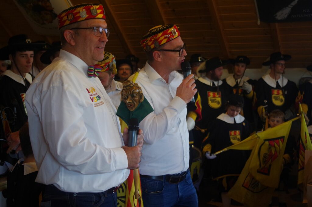 Mit „Eckhex hoi“ wird das Aulendorfer Fasnetslied angestimmt. Die Begrüßung durch den Zunftmeister Flo Angele und seinen Stellvertreter Michael Weißenrieder dauert fast länger als das eigentliche Programm, bis alle Amtsträger aus der Gemeinde, Schule, Politik, Kirche und der Aulendorfer Zunft namentlich genannt sind. Währenddessen verteilt Werner Leser „Schnörkele“, das Aulendorfer Fasnetsgebäck, an das weit über 100-köpfige Publikum. Zuletzt wird Bürgermeister Matthias Burth aufgerufen, seine Begrüßung zu beginnen.