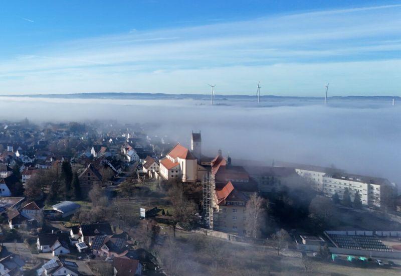 Reute / Zollenreute – Dieses Luftbild hat uns unser Leser Franz-Daniel Pfaff zukommen lassen. Es zeigt im Vordergrund Reute mit dem Kloster und im Hintergrund die Windkraftanlagen im Röschenwald bei Zollenreute. Drei der Türme sind fertig, der vierte ist im Bau. Die Aufnahme stammt vom 18. Dezember.