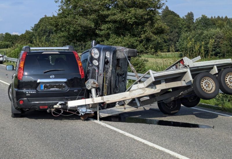 Bad Waldsee – Am Samstag gegen 17.05 Uhr befuhr ein 22-jähriger Nissan-Fahrer mit seinem Pkw und einem Anhänger die B30 von Bad Waldsee kommend in Richtung Gaisbeuren. Auf einer langen Geraden fing der Anhänger hinter dem Pkw plötzlich an zu schlingern und zu schwanken. Schließlich scherte der Anhänger gänzlich aus und landete auf der Motorhaube eines entgegenkommenden Audi. Anschließend drehte sich das gesamte Gespann um 180 Grad, bis es zum Stehen kam.