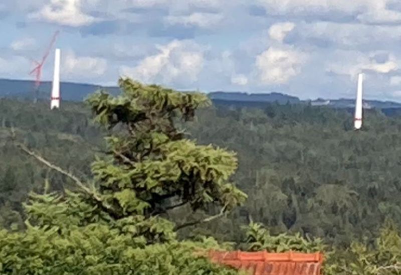 Zollenreute / Wolpertswende – Zwei der vier Windkrafttürme im Röschenwald wachsen derzeit in die Höhe. Die Aufnahme wurde am 4. September von Bruno Friedmann von Wolpertswende aus (Ortsmitte) mit dem Handy gemacht. Insgesamt werden im Bereich Zollenreute / Wolpertswende vier WKA mit einer Gesamthöhe von jeweils 246 Meter bis zur Rotorspitze (Nabenhöhe: 166 Meter) gebaut.