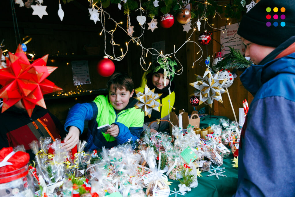 Bei wechselhaftem Dezemberwetter konnten sich die Besucher am Stand der Schule mit selbstgebackenen Plätzchen, kandierten Nüssen, Walnüssen und Selbstgebasteltem für die Vorweihnachtszeit eindecken. Der Erlös kam den Klassen 5 zugute. Beim traditionellen Kinderadvent am Sonntag traten die Bläserklassen 5 und 6 mit insgesamt 70 Schülern unter der Leitung von Christof Lang und Steffen Ocker auf.