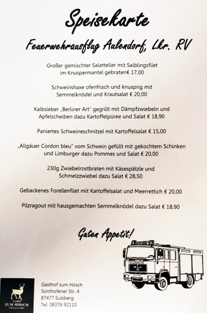 Anschließend stand ein gemeinsames Mittagessen im gemütlichen Gasthof „Zum Hirsch“ auf dem Programm. Es gab eine eigene Speisekarte, die speziell für die Gruppe der Feuerwehr Aulendorf zusammengestellt worden war. Bei regionalen Spezialitäten und erfrischenden Getränken konnten sich alle stärken und die entspannte Atmosphäre genießen.