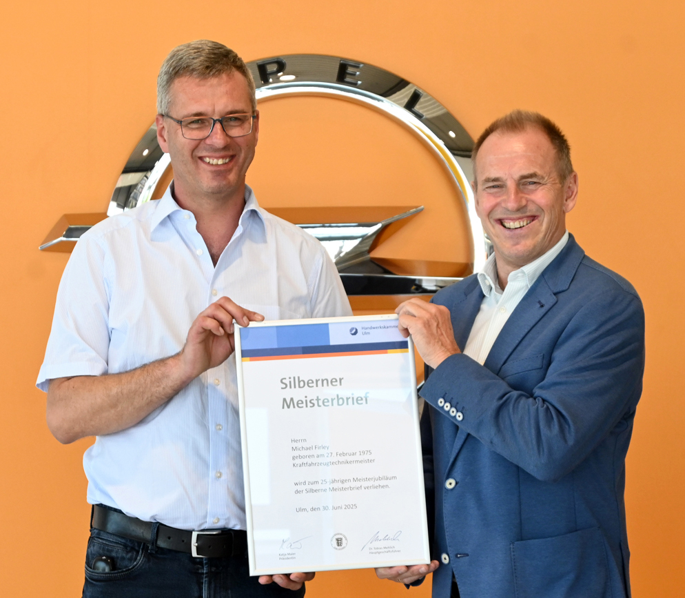 Aulendorf – In einer internen kleinen Feierstunde überreichte Franz Moosherr, Geschäftsführer der Kreishandwerkerschaft Ravensburg, Michael Firley vom gleichnamigen Autohaus den Silbernen Meisterbrief.