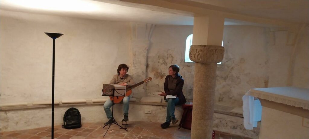 Eine Wallfahrt ist auch Gelegenheit zur Andacht und diese fand mit der Krypta unterhalb der Schlosskirche einen geeigneten Rahmen für Meditation und Andacht, transformatorisch dicht gestaltet von Pastoralreferentin Daniela Mangold und ihre Gedanken zur ausgewählten Bibelstelle, während Isolde Rothmund an der Gitarre begleitete. Lieder und Texte waren behutsam ausgesucht, hallten noch lange in der Stille nach.