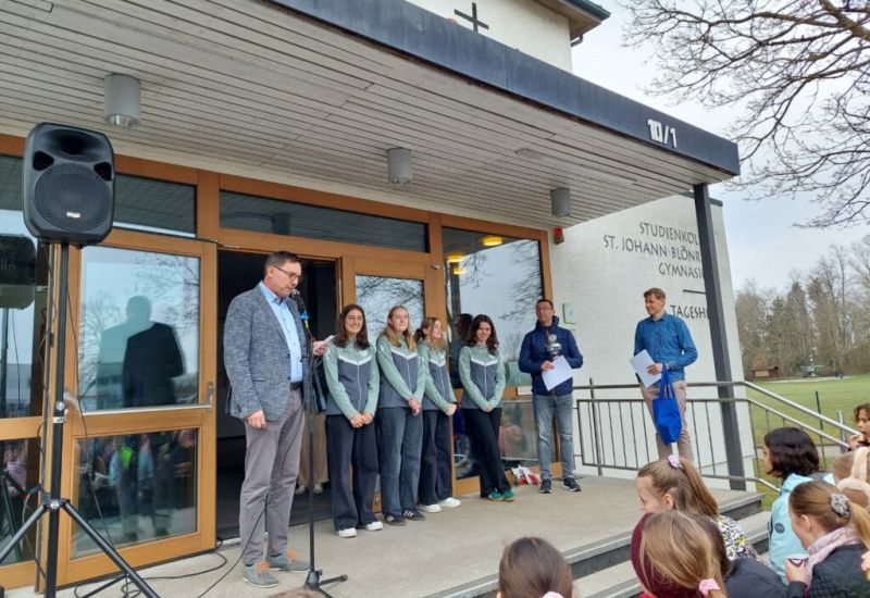 Dieser Titel ist ein großer Erfolg für das Studienkolleg, sodass Herr Pauer zurecht stolz auf seine Mannschaft ist. Und so wurde diese nach ihrer Rückkehr auch vor der versammelten Schulgemeinschaft von Schulleiter Marc Grünbaum vorgestellt und geehrt.