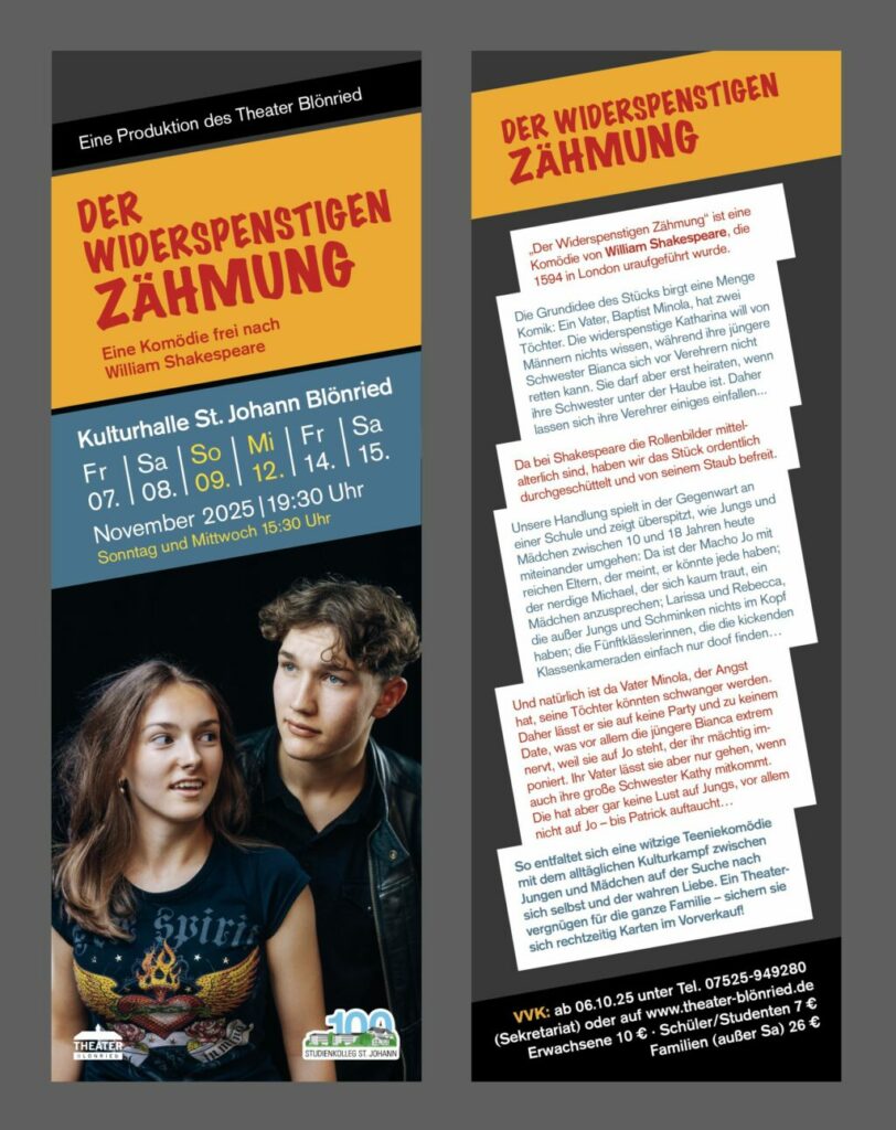 Sie können über das Sekretariat des Studienkollegs St. Johann (Tel. 07525 949 280) oder online unter www.theater-bloenried.de gebucht werden.