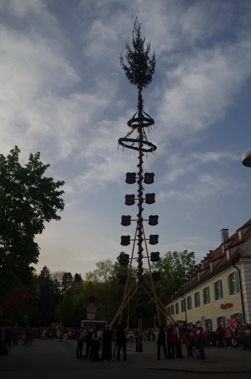 Bei dem guten Wetter hatten sich am Schlossplatz hunderte von Zuschauern versammelt, um dem Schauspiel beizuwohnen. Viele starke Männer hievten den 22 Meter hohen und frisch geschälten Lindenbaum in Etappen in die Höhe, angefeuert von den Trommelschlägen und Fanfaren. Danach wurde weiter gefeiert, wobei man nicht beim Wasser blieb. Auch der Bürgermeister wechselte später zum Produkt der heimischen Brauerei.