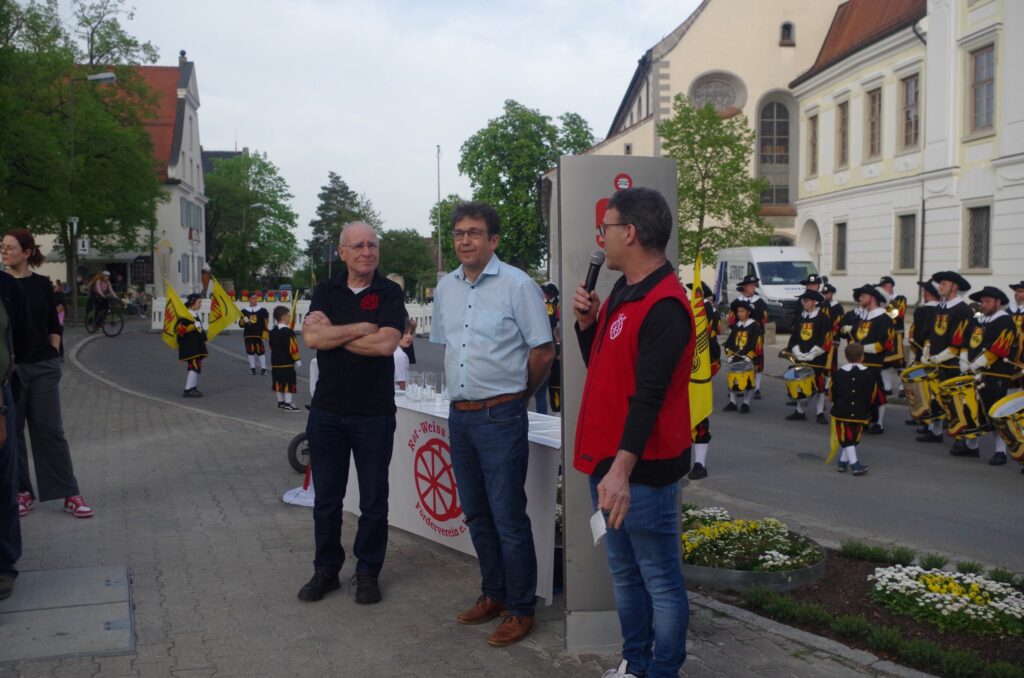 Aulendorf – Am Abend vor dem 1. Mai um 19.00 Uhr hat es noch 23 Grad Außentemperatur. Ein sonniger Tag geht zu Ende und somit sind es ideale Umstände für die Einweihung des neuen Trinkbrunnens am Schlossplatz. Dank der zahlreichen Spenden schon vor Weihnachten und dem Crowdfunding konnte der Förderverein Rot-Weiß-Rad e.V. den Trinkbrunnen für die Stadt Aulendorf und ihre Bürgerinnen und Bürger sowie Besucher verwirklichen. Die Einweihung des Trinkbrunnens fand im Rahmen des Maibaumstellens statt.