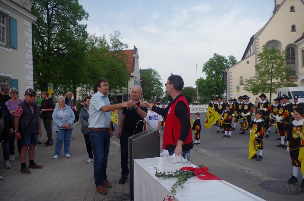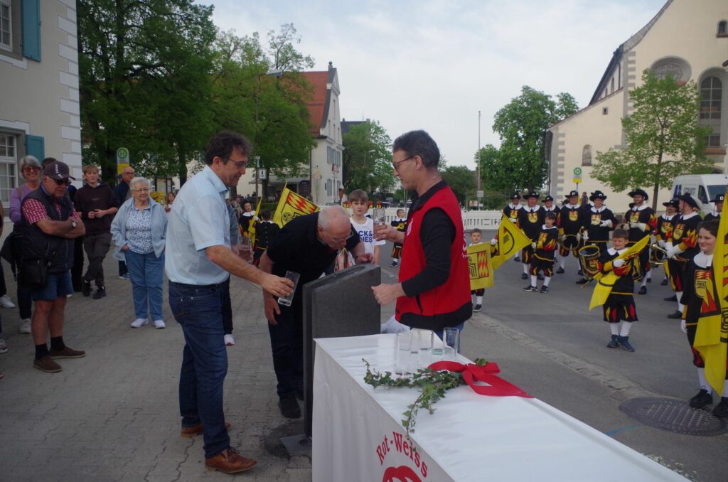 Die Einweihung des Trinkbrunnens fand im Rahmen des Maibaumstellens statt. Burth bedankte sich beim Fanfarenzug Aulendorf, der das Maibaumstellen und die Einweihung musikalisch umrahmten. Ein guter Grund sei, den Trinkbrunnen hier sichtbar an der Straße zu platzieren, denn die heißen Tage in den Städten werden immer mehr, so Burth weiter.