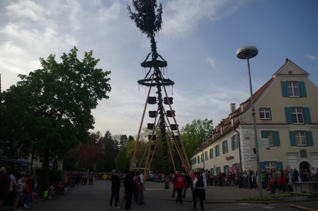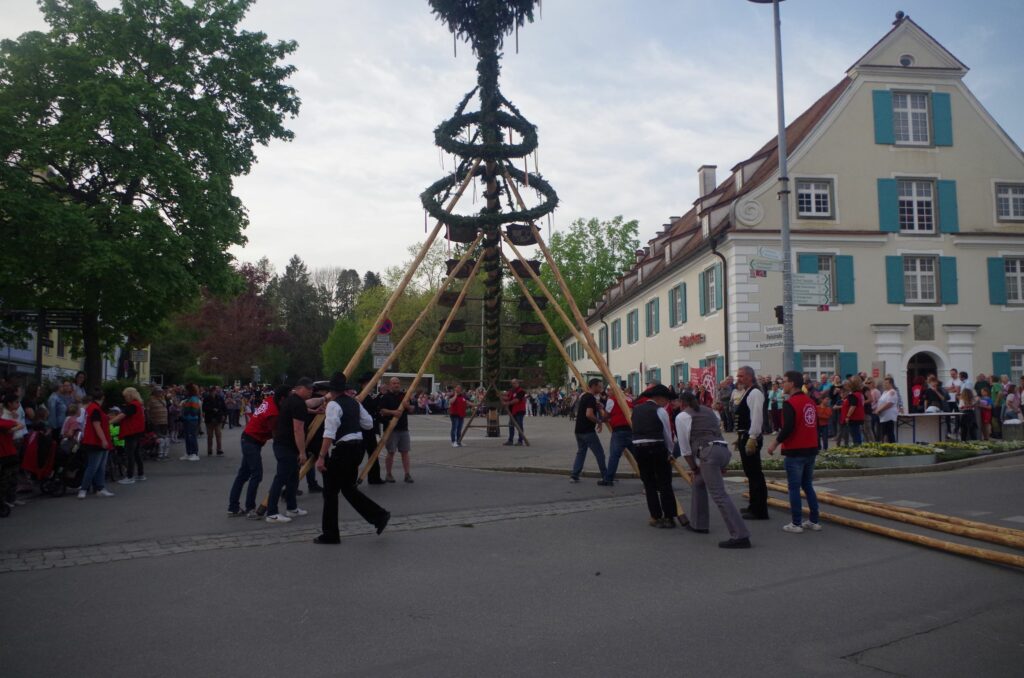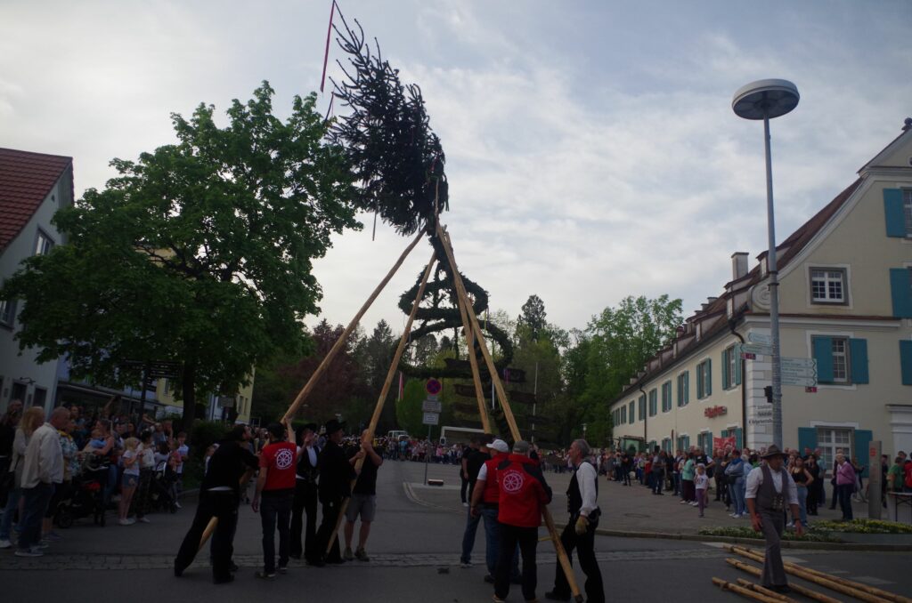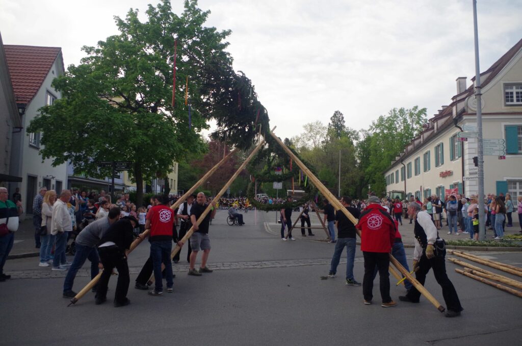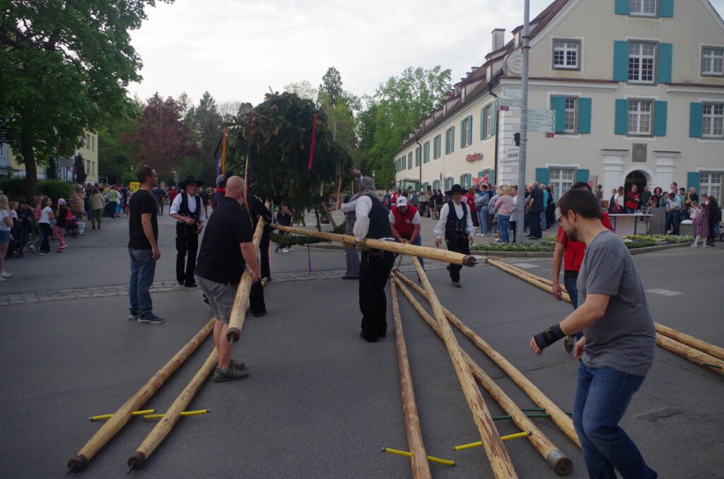 Starke Männer legen Hand an. Der Maibau wurde nach alter Väter Sitte aufgestellt.