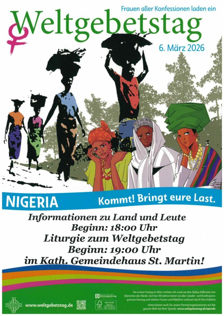 Aulendorf – Am Freitag, 6. März, feiern Menschen in über 150 Ländern der Erde den Weltgebetstag der Frauen. Die Texte, Lieder und Gebete dafür haben Frauen aus Nigeria erarbeitet. „Kommt! Bringt eure Last.“ lautet ihr Motto.