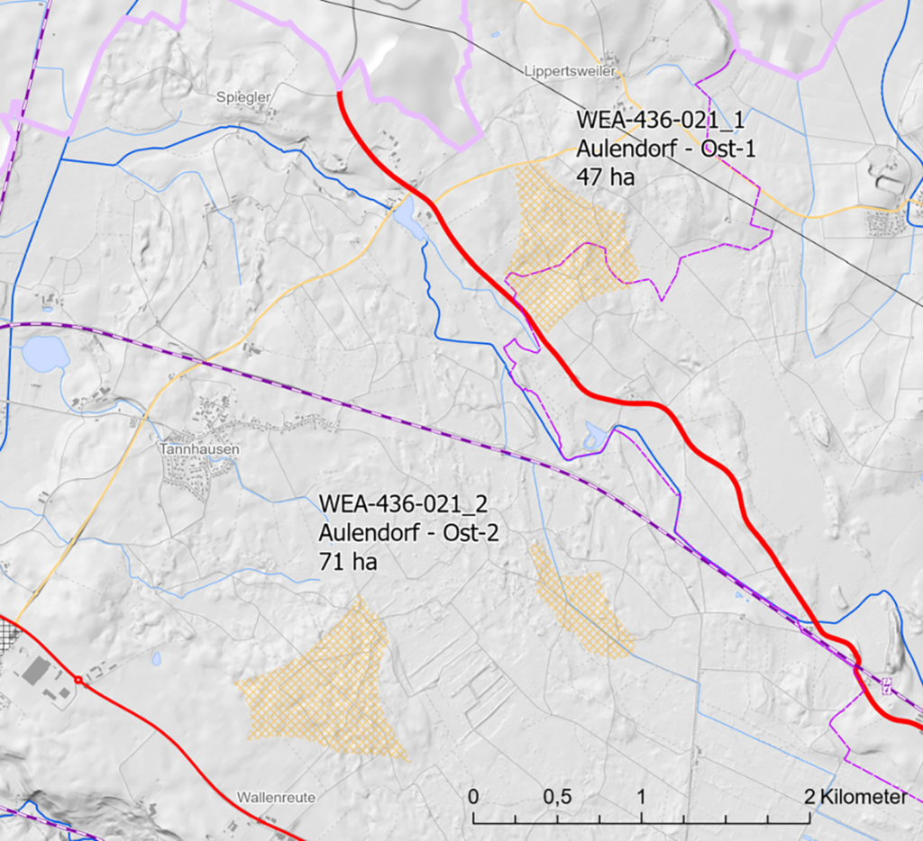 Die WKA-Vorranggebiete „Aulendorf-Ost 1“ (47 ha) und „Aulendorf Ost-2“ (71 ha). Östlich schließt sich Windkraft bei Michelwinnaden an.