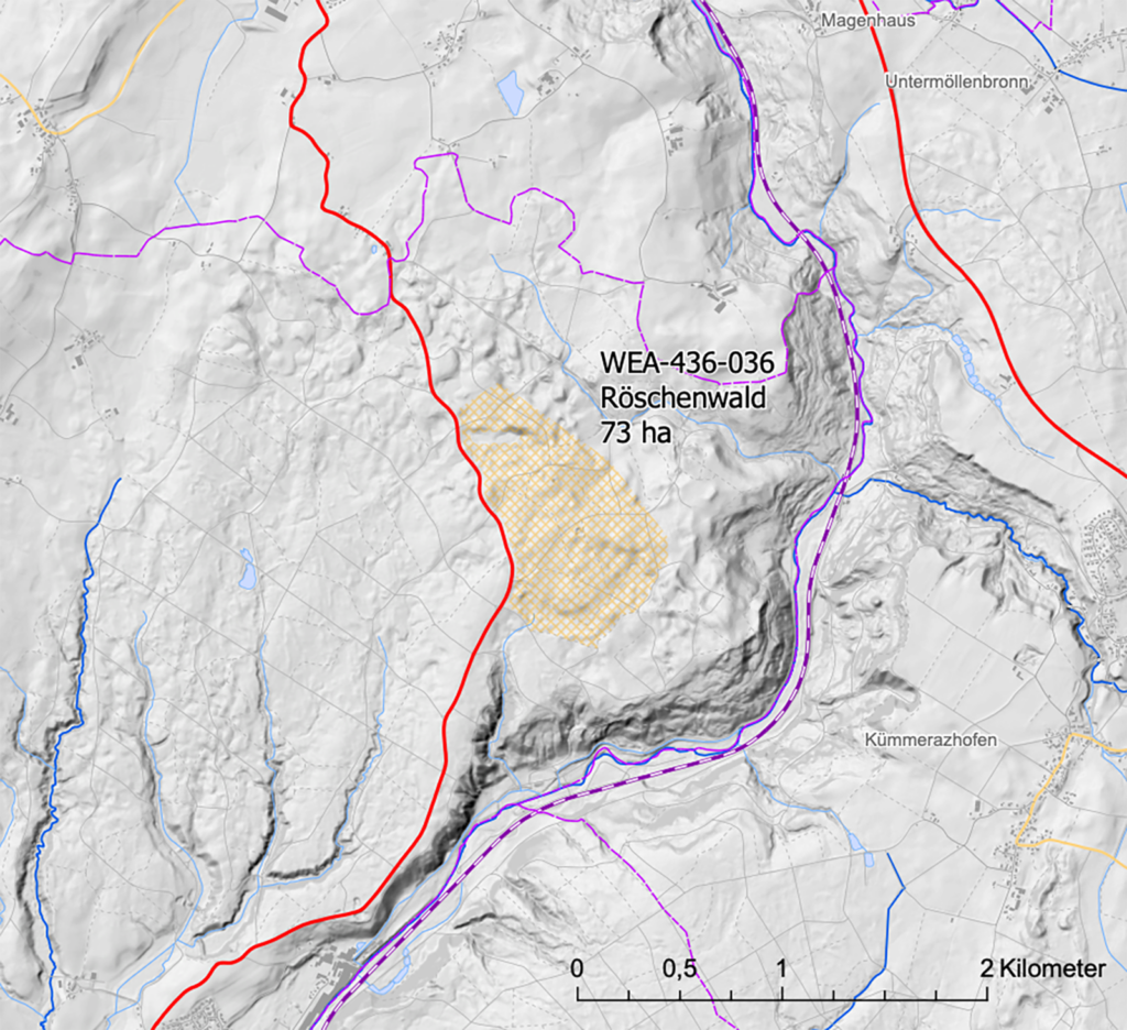 Das WKA-Vorranggebiet „Röschenwald“ südlich von Zollenreute (73 ha).