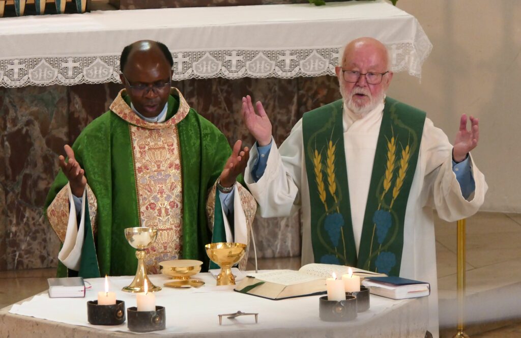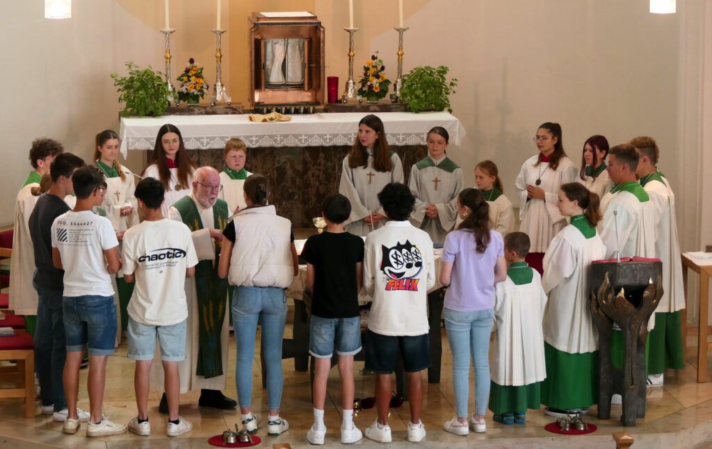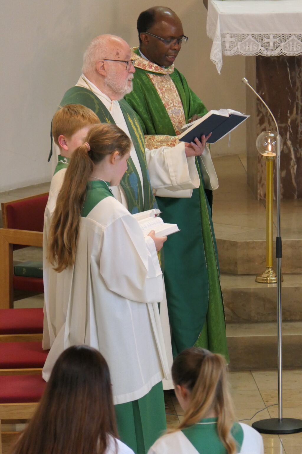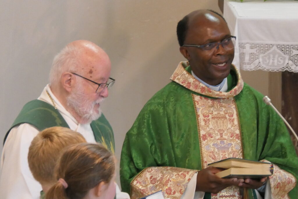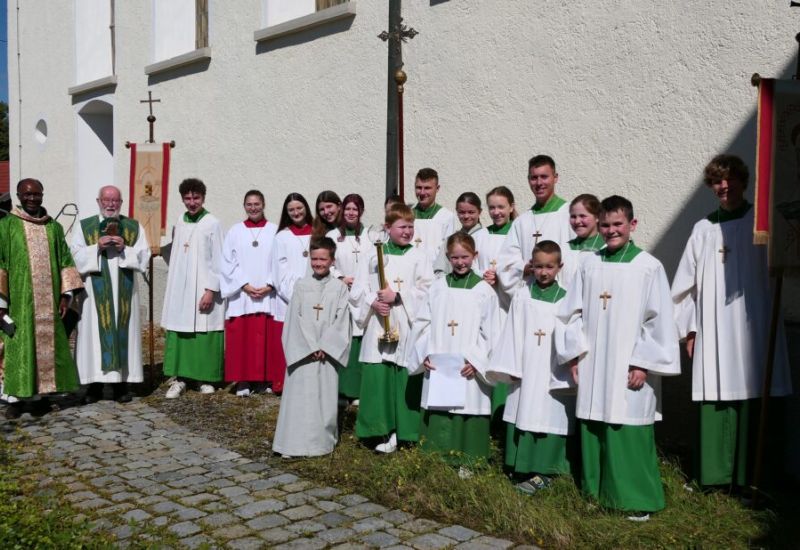 Molpertshaus – Mit insgesamt 17 Ministrantinnen und Ministranten aus den Kirchengemeinden Molpertshaus, Bergatreute und Alttann haben Pfarrer i. R. Adolf Schuhmacher und sein Bruder im geistlichen Amt, Dr. Juvenal Ilunga Muya aus Kolwezi im Süden der Demokratischen Republik Kongo, am 14. Juli in der Pfarrkirche St. Katharina in Molpertshaus Gottesdienst gefeiert. Organisiert und in weiten Teilen vorbereitet wurde der Gottesdienst von Ellen Liebrich und Simon Kling, dem Oberministranten-Duo der derzeit 25 Ministrantinnen und Ministranten von Molpertshaus.